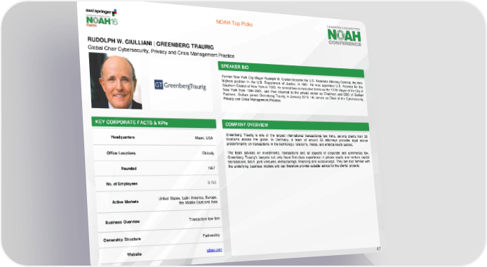NOAH Top Picks RUDOLPH W. GIULLIANI | GREENBERG TRAURIG Global Chair Cybersecurity, Privacy and Crisis Management Practice SPEAKER BIO Former New York City Mayor Rudolph W. Giuliani became the U.S. Associate Attorney General, the third highest position in the U.S. Department of Justice, in 1981. He was appointed U.S. Attorney for the Southern District of New York in 1983. He served two consecutive terms as the 107th Mayor of the City of New York from 1994-2001, and then returned to the private sector as Chairman and CEO of Giuliani Partners. Giuliani joined Greenberg Traurig in January 2016. He serves as Chair of the Cybersecurity, Privacy and Crisis Management Practice. KEY CORPORATE FACTS & KPIs COMPANY OVERVIEW Headquarters Miami, USA Greenberg Traurig is one of the largest international transactional law firms, serving clients from 38 locations across the globe. In Germany, a team of around 55 attorneys provides legal advice predominantly on transactions in the technology, telecoms, media, and entertainment sectors. Office Locations Globally The team advises on investments, transactions and all aspects of corporate and commercial law. Greenberg Traurig’s lawyers not only have first-class experience in private equity and venture capital transactions, M&A, joint ventures, restructurings, financing and outsourcings. They are also familiar with Founded 1967 the underlying business models and can therefore provide suitable advice for the clients’ projects. No. of Employees 3,750 Active Markets United States, Latin America, Europe, the Middle East and Asia Business Overview Transaction law firm Ownership Structure Partnership Website gtlaw.com 47