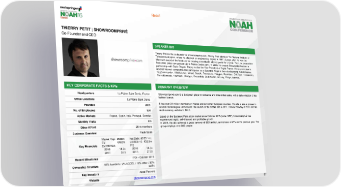 Retail THIERRY PETIT | SHOWROOMPRIVÉ Co-Founder and CEO SPEAKER BIO Thierry Petit is the co-founder of showroomprive.com,.Thierry Petit attended The National Institute of Telecommunication, where he obtained an engineering degree in 1997. 2 years after, he won the Microsoft award of the best app for creating a worldwide internet portal for L’Oréal. Then, he created the first online price comparison site in France (toobo.com). In 2006, he created Showroomprive.com in partnership with David Dayan. Thierry is also the Vice-President of Digital France. He is an investor in several Internet companies and participates as a Business Angel in their development: Avisdemaman, TagCommander, AlittleMarket, Vinted, Soubis, Doyoubuzz, Platypus, Redvisitor, ChicType, Testamento, Carnetdemode, Youmiam, Chictype, Brocantlab, Backmarket, Abtasty, Cubyn, talent.io. KEY CORPORATE FACTS & KPIs COMPANY OVERVIEW Headquarters La Plaine Saint Denis, France Showroomprivé.com is a European player in exclusive and time-limited sales, with a daily selection of big Office Locations La Plaine Saint Denis fashion brands. Founded 2006 It has over 24 million members in France and in 8 other European counties. The site is also a pioneer in several technological innovations: the launch of the mobile site in 2011, 24 hour delivery in 2012 and the No. of Employees 830 multi-currency website in 2014. Active Markets France, Spain, Italy, Portugal, Benelux Listed on the Euronext Paris stock market since October 2015 (code: SRP), Showroomprivé has Monthly Visits 2m experienced rapid, self-financed and profitable growth. In 2015, the site achieved a gross turnover of €600 million, an increase of 27% on the previous year. The Other KPI #1 25 m members group employs over 800 people. Business Overview Flash Sales Market Cap: €588m Net Debt: (€125.1m) EV: €462m EBITDA 16: €32.5m Key Financials EV/EBITDA P/E 2016: 14.2x 2016: 54.5x 2017: 9.7x 2017: 27.2x Recent Milestones IPO – October 2015 Ownership Structure 44% founders / 9% ACCEL / 12% other / 36% public Key Investors Accel Partners Website showroomprive.com 87