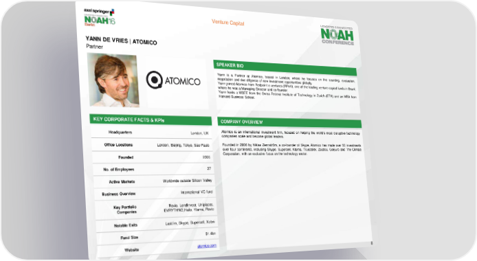 Venture Capital YANNDE VRIES| ATOMICO Partner SPEAKER BIO Yann is a Partner at Atomico, based in London, where he focuses on the sourcing, evaluation, negotiation and due diligence of new investment opportunities globally. Yann joined Atomico from Redpoint e.ventures (RPeV), one of the leading venture capital funds in Brazil, where he was a Managing Director and co-founder. Yann holds a MSEE from the Swiss Federal Institute of Technology in Zurich (ETH) and an MBA from Harvard Business School. - KEY CORPORATE FACTS & KPIs COMPANY OVERVIEW Headquarters London, UK Atomico is an international investment firm, focused on helping the world’s most disruptive technology companies scale and become global leaders. Office Locations London, Beijing, Tokyo, Sao Paulo Founded in 2006 by Niklas Zennström, a co-founder of Skype, Atomico has made over 50 investments over four continents, including Skype, Supercell, Klarna, Truecaller, Zocdoc, GoEuro and The Climate Founded 2006 Corporation, with an exclusive focus on the technology sector. No. of Employees 27 Active Markets Worldwide outside Silicon Valley Business Overview International VC fund Key Portfolio Rovio, LendInvest, Uniplaces, Companies EVRYTHNG,Hailo, Klarna, Rovio Notable Exits Last.fm, Skype, Supercell, Xobni Fund Size $1.4bn Website atomico.com 8