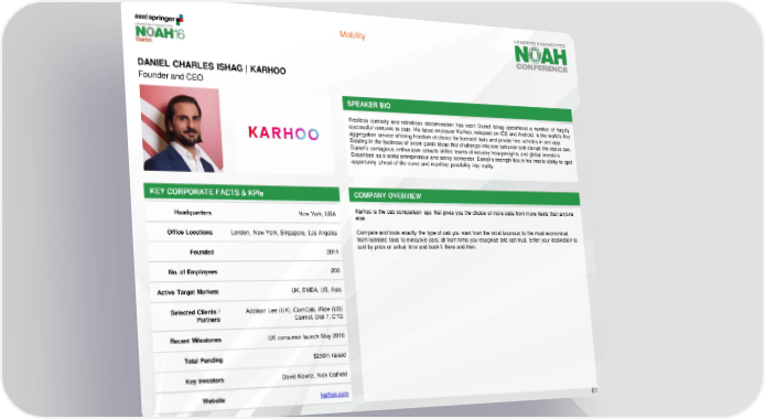 Mobility DANIEL CHARLES ISHAG | KARHOO Founderand CEO SPEAKER BIO Restless curiosity and relentless determination has seen Daniel Ishag spearhead a number of hugely successful ventures to date. His latest endeavor Karhoo, released on iOS and Android, is the world’s first aggregation service offering freedom of choice for licensed taxis and private hire vehicles in one app. Dealing in the business of avant-garde ideas that challenge inherent behavior and disrupt the status quo, Daniel’s contagious enthusiasm attracts skilled teams of industry heavyweights and global investors. Described as a serial entrepreneur and savvy connector, Daniel’s strength lies in his innate ability to spot opportunity ahead of the curve and manifest possibility into reality. KEY CORPORATE FACTS & KPIs COMPANY OVERVIEW Headquarters NewYork, USA Karhoo is the cab comparison app that gives you the choice of more cabs from more fleets than anyone else. Office Locations London, New York, Singapore, Los Angeles Compare and book exactly the type of cab you want from the most luxurious to the most economical, from licensed taxis to executive cars, all from firms you recognise and can trust. Enter your destination to Founded 2014 sort by price or arrival time and book it there and then. No. of Employees 200 Active Target Markets UK, EMEA, US, Asia Selected Clients / Addison Lee (UK), ComCab, iRide (US) Partners Carmel, Dial 7, CTG Recent Milestones UK consumer launch May 2016 Total Funding $250m raised Key Investors David Kowitz, Nick Gatfield Website karhoo.com 61