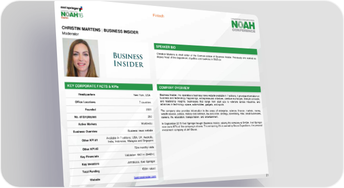 Fintech CHRISTIN MARTENS | BUSINESS INSIDER Moderator SPEAKER BIO Christian Martens is chief editor of the German edition of Business Insider. Previously she worked as deputy head of the department of politics and business in BILD.de KEY CORPORATE FACTS & KPIs COMPANY OVERVIEW Headquarters New York, USA Business Insider, Inc. operates a business news website available in 7 editions. It provides information on business and technology happenings, entrepreneurial initiatives, creative exchanges, lifestyle concepts, Office Locations 7 countries and leadership insights; businesses that range from start ups to veterans across industries; and advances in technology space, automobiles, gadgets, and sports. Founded 2009 The company also provides information in the areas of enterprise, science, finance, markets, money, No. of Employees 250 wealth advisor, politics, military and defence, law and order, strategy, advertising, retail, small businesses, careers, life, education, transportation, and entertainment. Active Markets Worldwide In September 2015 Axel Springer bought Business Insider, valuing the company at $442m. Axel Springer now owns97%of the company’s shares. The remaining 3% is owned byBezos Expeditions, the personal Business Overview Business news website investment company of Jeff Bezos. Other KPI #1 Available in 7 editions; USA, UK, Australia, India, Indonesia, Malaysia and Singapore Other KPI #2 72mmonthly visits Key Financials Valutation: €401m ($442m) Key Investors Jeff Bezos, Axel Springer Total Funding €50m raised Website businessinsider.com 21