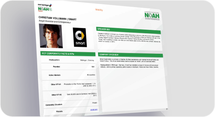 Mobility CHRISTIAN VOLLMANN| SMART Angel Investor and Entrepreneur SPEAKER BIO Christian Vollmann is known as a German serial-entrepreneur and one of the most active angel investors in Germany. He is also an advisory board member of the Federation of German Startups and part of the “Young Digital Economy” Advisory Board of the German Federal Ministry for Economic Affairs. Today, he is seeking to make our cities an even better place to live with his new venture nebenan.de, which he founded in 2015. KEY CORPORATE FACTS & KPIs COMPANY OVERVIEW Headquarters Böblingen, Germany Smart Automobile is a division of Daimler AG that manufactures and markets the Smart Fortwo and Smart Forfour. The official trademarked name is stylized as "smart", with all lowercase letters. Headquartered in Böblingen, Germany, Smart has marketed a range of microcar and subcompact Founded 1994 vehicles, with its primary assembly plants located in Hambach, France and Novo Mesto, Slovenia. Active Markets 46 countries Other KPI #1 Production of the Fortwo had surpassed 1.7m units by early 2015 Other KPI #2 Sold 38,000 cars in Germany from 2008 to 2015 Ownership Structure Private Website smart.com 91