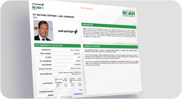 TMT & Gaming DR. MATHIAS DÖPFNER | AXEL SPRINGER CEO SPEAKER BIO Mathias has been with Axel Springer SE since 1998. Initially as editor-in-chief of Die Welt. Dr Mathias Döpfner became member of the Executive Board responsible for the Multimedia Division in July 2000 and took charge of the Newspapers Division as well in October 2000. He has been CEO of the Axel Springer SEsince January 2002. Mathias studied musicology, German and theatrical arts in Frankfurt and Boston. Hestarted his career as a journalist at the “Frankfurter Allgemeine Zeitung” in 1982. He was director of a PRagency from1988 to 1990. KEY CORPORATE FACTS & KPIs COMPANY OVERVIEW Headquarters Berlin, Germany Axel Springer SE wants to become the leading digital publisher. The digital media channels already contribute more than 60% of total pro-forma revenues today. Office Locations Worldwide One of Europe's largest media companies also started off in a kind of garage. Axel Springer founded his Founded 1946 publishing house in Hamburg in 1946; the editors spent the first year working above a warehouse for tea and spices, often without electricity and using borrowed typewriters. No. of Employees 150,023 As a result of consistent internationalization and digitization, Axel Springer SE today is not only market Active Markets Worldwide leader in the German print business, but is also active in more than 40 countries through subsidiaries, joint ventures and licenses. Business Overview Media corporation Recent Milestones Acquired Business Insider for $450m in September 2015 Market Cap: €5bn Net Debt: €1bn EV: €7.6bn EBITDA 16: €592m Key Financials EV/EBITDA P/E 2016: 11.0x 2016: 20.0x 2017: 10.0x 2017: 23.0x Ownership Structure Public Website axelspringer.de 13