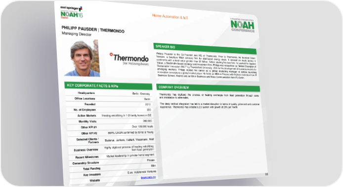 Home Automation & IoT PHILIPP PAUSDER | THERMONDO Managing Director SPEAKER BIO Philipp Pausder is the Co-Founder and MD of Thermondo. Prior to Thermondo, he founded Clean Venture, a boutique M&A advisory firm for distributed energy deals. It advised on deals across 4 continents with a total value greater than $1 billion. Before starting his own firm, he worked for Applied Value, a Stockholm-based strategy and investment firm. Philipp was recognized as “Global Champion of Sustainable Innovation 2007” by Thunderbird University, USA for his development of business models for emerging markets. Philipp started his career as a global marketing manager at adidas launching innovation concepts to a global market place. He holds an MBA in Finance with highest distinction from IE Business School, Madrid and an MA in Business and Mass Communication from FU Berlin. KEY CORPORATE FACTS & KPIs COMPANY OVERVIEW Headquarters Berlin, Germany Thermondo has digitized the process of heating exchange from lead generation through sales Office Locations Berlin and installation to after-sales. Founded 2012 The deep vertical integration has led to a market disruption in terms of quality, price and and customer experience. Thermondo has created a 2.0 system with growth of 20% per month. No. of Employees 220 Active Markets Heating retrofitting in 1-2-family homes in DE Monthly Visits 260,000 Other KPI #1 Over 100,000 leads Other KPI #2 864% CAGR confirmed by Ernst & Young Selected Clients / Buderus, Junkers, Vaillant, Viessmann, Wolf Partners Business Overview Highly digitized process of heating retrofitting from lead generation Recent Milestones Market leadership in private home segment Ownership Structure Private Total Funding €6m Key Investors E.on, Holtzbrinck Ventures Website thermondo.de 99