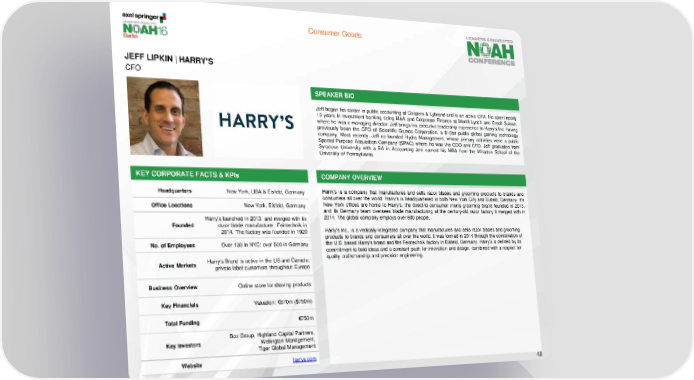 Consumer Goods JEFF LIPKIN | HARRY’S CFO SPEAKER BIO Jeff began his career in public accounting at Coopers & Lybrand and is an active CPA. He spent nearly 13 years in investment banking doing M&A and Corporate Finance at Merrill Lynch and Credit Suisse, where he was a managing director. Jeff brings his executive leadership experience to Harry's Inc, having previously been the CFO of Scientific Games Corporation, a $10bn public global gaming technology company. Most recently, Jeff co-founded Hydra Management, whose primary activities were a public Special Purpose Acquisition Company (SPAC) where he was the COO and CFO. Jeff graduated from Syracuse University with a BA in Accounting and earned his MBA from the Wharton School of the University of Pennsylvania. KEY CORPORATE FACTS & KPIs COMPANY OVERVIEW Headquarters New York, USA & Eisfeld, Germany Harry’s is a company that manufactures and sells razor blades and grooming products to brands and consumers all over the world. Harry's is headquartered in both New York City and Eisfeld, Germany. It's Office Locations New York, Eisfeld, Germany New York offices are home to Harry's, the direct-to-consumer men's grooming brand founded in 2013, and its Germany team oversees blade manufacturing at the century-old razor factory it merged with in Harry's launched in 2013, and merged with its 2014. The global company employs over 600 people. Founded razor blade manufacturer, Feintechnik in Harry's Inc., is a vertically-integrated company that manufactures and sells razor blades and grooming 2014. The factory was founded in 1920 products to brands and consumers all over the world. It was formed in 2014 through the combination of No. of Employees Over 130 in NYC; over 500 in Germany the U.S. based Harry’s brand and the Feintechnik factory in Eisfeld, Germany. Harry's is defined by its commitment to bold ideas and a constant push for innovation and design, combined with a respect for Harry's Brand is active in the US and Canada; quality craftsmanship and precision engineering. Active Markets private label customers throughout Europe Business Overview Online store for shaving products Key Financials Valuation: €670m ($750m) Total Funding €750m Box Group, Highland Capital Partners, Key Investors Wellington Management, Tiger Global Management Website harrys.com 48