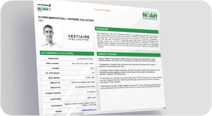Consumer Goods OLIVIER MARCHETEAU | VESTIAIRE COLLECTIVE CEO SPEAKER BIO Olivier Marcheteau is the CEO of Vestiaire Collective, a luxury goods sales site owner. After an early career in the marketing of the consumer goods sector, first at Procter & Gamble, then at Nike in France, Olivier Marcheteau turned to the web and e-commerce by integrating an auction start- up (Aucland) in 2000. Over the years, he became a recognized expert in the world of French and European web marketing, thanks to its 10 years of activity within the Microsoft US IT multinational. In 2010 he was appointed head of Cdiscount and non-food sales division of the Casino Group for the development strategy in France and abroad. In 2014, he decided to leave his position in Cdiscount and to join Vestiaire Collective. KEY CORPORATE FACTS & KPIs COMPANY OVERVIEW Headquarters Levallois-Perret, France Vestiaire Collective was launched in 2009 with the aim of offering a community platform on which members are able to buy and sell, top of the range and pre-owned luxury clothes and accessories. Office Locations Paris, New York, London, Berlin The catalogue is comprised of the most inspiring items coming from the wardrobes of hundreds of thousands of users throughout the World. Founded 2009 This selection meets the specific expectations of buyers from across the entire World. Each week, more No. of Employees 180 that 20,000 new items selected by a team of stylists are put on-line and add to strengthening a permanent catalogue of 400,000 products. Active Markets Europe, USA The site stands out on the basis of its unique quality control. 100% of the products are physically checked Other KPI #1 100,000 new members each month by a team of experts. More than 100,000 new members sign up each month, and join an international community of 4 million members. Other KPI #2 3m transactions each months These generate more than 3 million transactions each month. To date 180 people are employed by the start-up and spread across the offices in Paris, New York, London, Berlin and soon Milan and Madrid. Business Overview E-commerce Total Funding $69m raised Key Investors Balderton Capital, Eurazéo, Idinvest Partners, Ventech, Condé Nast Website vestiairecollective.com 105