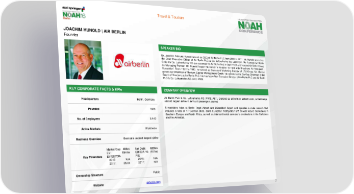 Travel & Tourism JOACHIM HUNOLD | AIR BERLIN Founder SPEAKER BIO Mr. Joachim Edmund Hunold served as CEO of Air Berlin PLC from 2006 to 2011. Mr. Hunold served as the Chief Executive Officer of Air Berlin PLC & Co. Luftverkehrs KG until 2011. He founded Air Berlin GmbH&Co.Luftverkehrs KG (as successor to Air Berlin Inc) in April 1991 and headed Air Berlin Group as Managing Partner. Mr. Hunold began his career in Aviation in 1978 with Braathens Air Transport , Dusseldorf. From 1982 to 1990, he served as Sales and Marketing Director of LTU Group. Mr. Hunold serves as Chairman of Rantum Capital Management Gmbh. He serves as the Co-Vice Chairman of the Board of Directors at Air Berlin PLC. He has been Non Executive Director of Air Berlin PLC and Air Berlin PLC&Co.Luftverkehrs KGsince 2006. KEY CORPORATE FACTS & KPIs COMPANY OVERVIEW Headquarters Berlin, Germany Air Berlin PLC & Co. Luftverkehrs KG (FWB: AB1), branded as airberlin or airberlin.com, is Germany's second largest airline in terms of passengers carried. Founded 1978 It maintains hubs at Berlin Tegel Airport and Düsseldorf Airport and operates a route network that includes a total of 17 German cities, some European metropolitan and several leisure destinations in Southern Europe and North Africa, as well as intercontinental services to destinations in the Caribbean No. of Employees 8,440 and the Americas. Active Markets Worldwide Business Overview German’s second largest airline Market Cap: €88m Net Debt: €856m EV: €944m EBITDA 16: (€47m) Key Financials EV/EBITDA P/E 2016: N/A 2016: N/A 2017: 26.0x 2017: N/A Ownership Structure Public Website airberlin.com 7