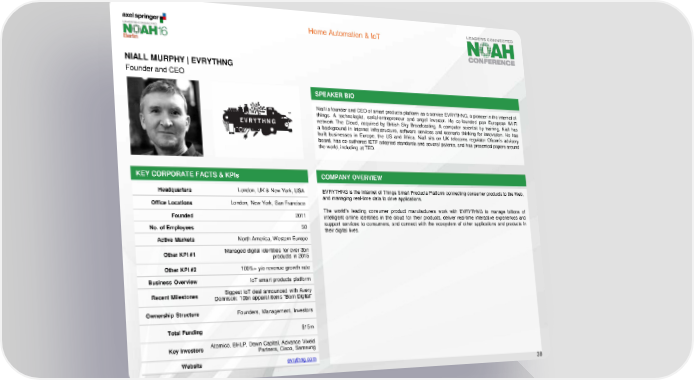 Home Automation & IoT NIALL MURPHY | EVRYTHNG Founder and CEO SPEAKER BIO Niall is founder and CEO of smart products platform-as-a-service EVRYTHNG, a pioneer in the internet of things. A technologist, serial-entrepreneur and angel investor. He co-founded pan European Wi-Fi network The Cloud, acquired by British Sky Broadcasting. A computer scientist by training, Niall has a background in internet infrastructure, software services and scenario thinking for innovation. He has built businesses in Europe, the US and Africa. Niall sits on UK telecoms regulator Ofcom’s advisory board, has co-authored IETF adopted standards and several patents, and has presented papers around the world, including at TED. KEY CORPORATE FACTS & KPIs COMPANY OVERVIEW Headquarters London, UK & New York, USA EVRYTHNGistheInternet of Things Smart ProductsPlatform connecting consumer products to theWeb, London, New York, San Francisco and managing real-time data to drive applications. Office Locations Founded 2011 The world’s leading consumer product manufacturers work with EVRYTHNG to manage billions of intelligent online identities in the cloud for their products, deliver real-time interactive experiences and No. of Employees 50 support services to consumers, and connect with the ecosystem of other applications and products in their digital lives. Active Markets North America, Western Europe Other KPI #1 Managed digital identities for over 3bn products in 2015 Other KPI #2 100%+ y/o revenue growth rate Business Overview IoT smart products platform Recent Milestones Biggest IoT deal announced with Avery Dennison: 10bn apparel items “Born Digital” Ownership Structure Founders, Management, Investors Total Funding $15m Key Investors Atomico, BHLP, Dawn Capital, Advance Vixeid Partners, Cisco, Samsung Website evrythng.com 39