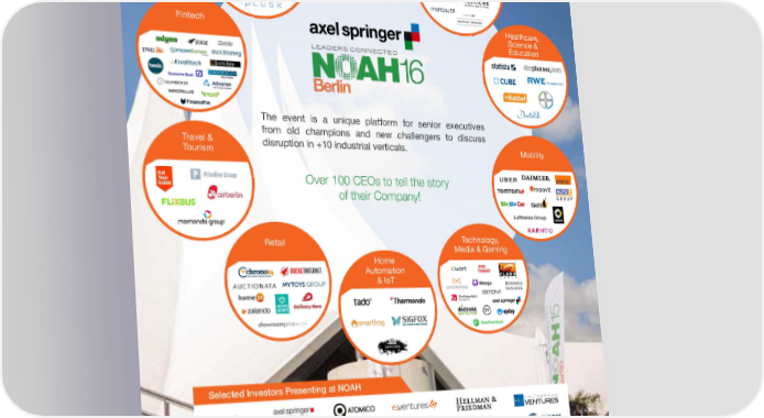 Connecting Leaders to Support the European Digital Ecosystem! B2B Advertising Consumer Goods Fintech Healthcare, Science & Education The event is a unique platform for senior executives from old champions and new challengers to discuss Travel & disruption in +10 industrial verticals. Mobility Tourism Over 100 CEOs to tell the story of their Company! Retail Technology, Media & Gaming Home Automation & IoT Selected Investors Presenting at NOAH Investors Presenting at NOAH eventures NOAH B2B Top Picks Presenting at NOAH Payment Professional Wealth Secondary Leadership Services Networking Management Market Services Legal Strategy Audience Market Data Services Consulting Measurement Research Collection CRM Marketing Coworking Platform Cloud