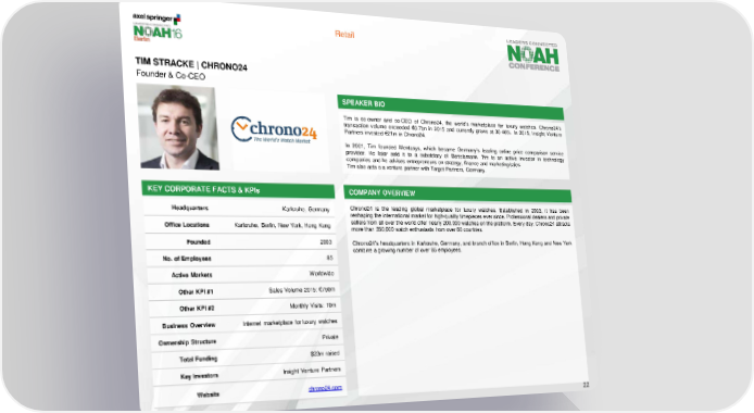 Retail TIM STRACKE | CHRONO24 Founder & Co-CEO SPEAKER BIO Tim is co-owner and co-CEO of Chrono24, the world's marketplace for luxury watches. Chrono24’s transaction volume exceeded €0.7bn in 2015 and currently grows at 30-40%. In 2015, Insight Venture Partners invested €21m in Chrono24. In 2001, Tim founded Mentasys, which became Germany’s leading online price comparison service provider. He later sold it to a subsidiary of Bertelsmann. Tim is an active investor in technology companies and he advises entrepreneurs on strategy, finance and marketing/sales. Tim also acts a a venture partner with Target Partners, Germany. KEY CORPORATE FACTS & KPIs COMPANY OVERVIEW Headquarters Karlsruhe, Germany Chrono24 is the leading global marketplace for luxury watches. Established in 2003, it has been reshaping the international market for high-quality timepieces ever since. Professional dealers and private Office Locations Karlsruhe, Berlin, New York, Hong Kong sellers from all over the world offer nearly 200,000 watches on the platform. Every day, Chrono24 attracts more than 350,000 watch enthusiasts from over 80 countries. Founded 2003 Chrono24’s headquarters in Karlsruhe, Germany, and branch office in Berlin, Hong Kong and New York combine a growing number of over 85 employees. No. of Employees 85 Active Markets Worldwide Other KPI #1 Sales Volume 2015: €750m Other KPI #2 Monthly Visits: 10m Business Overview Internet marketplace for luxury watches Ownership Structure Private Total Funding $23m raised Key Investors Insight Venture Partners Website chrono24.com 22