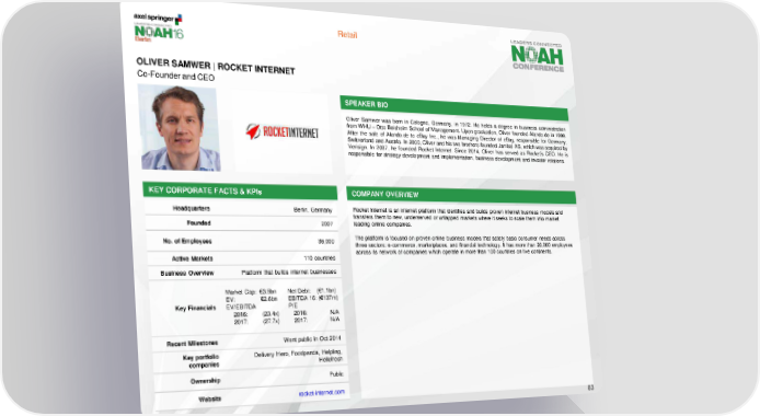 Retail OLIVER SAMWER | ROCKET INTERNET Co-Founder and CEO SPEAKER BIO Oliver Samwer was born in Cologne, Germany, in 1972. He holds a degree in business administration from WHU – Otto Beisheim School of Management. Upon graduation, Oliver founded Alando.de in 1999. After the sale of Alando.de to eBay Inc., he was Managing Director of eBay, responsible for Germany, Switzerland and Austria. In 2000, Oliver and his two brothers founded Jamba! AG, which was acquired by Verisign. In 2007, he founded Rocket Internet. Since 2014, Oliver has served as Rocket’s CEO. He is responsible for strategy development and implementation, business development and investor relations. KEY CORPORATE FACTS & KPIs COMPANY OVERVIEW Headquarters Berlin, Germany Rocket Internet is an internet platform that identifies and builds proven internet business models and transfers them to new, underserved or untapped markets where it seeks to scale them into market Founded 2007 leading online companies. No. of Employees 36,000 The platform is focused on proven online business models that satisfy basic consumer needs across three sectors: e-commerce, marketplaces, and financial technology. It has more than 20,000 employees Active Markets 110 countries across its network of companies which operate in more than 100 countries on five continents. Business Overview Platform that builds internet businesses Market Cap: €3.5bn Net Debt: (€1.1bn) EV: €2.6bn EBITDA 16: (€137m) KeyFinancials EV/EBITDA P/E 2016: (23.4x) 2016: N/A 2017: (27.7x) 2017: N/A Recent Milestones Went public in Oct 2014 Key portfolio Delivery Hero, Foodpanda, Helpling, companies Hellofresh Ownership Public Website rocket-internet.com 83