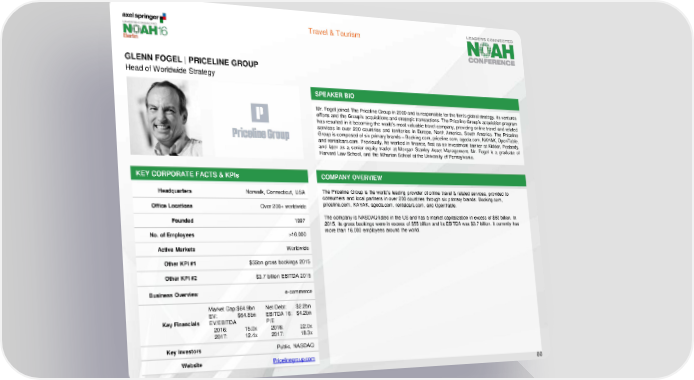 Travel & Tourism GLENN FOGEL | PRICELINEGROUP Headof Worldwide Strategy SPEAKER BIO Mr. Fogel joined The Priceline Group in 2000 and is responsible for the firm’s global strategy, its ventures efforts and the Group’s acquisitions and strategic transactions. The Priceline Group’s acquisition program has resulted in it becoming the world’s most valuable travel company, providing online travel and related services in over 200 countries and territories in Europe, North America, South America. The Priceline Group is composed of six primary brands – Booking.com, priceline.com, agoda.com, KAYAK, OpenTable, and rentalcars.com. Previously, he worked in finance, first as an investment banker at Kidder, Peabody, and later as a senior equity trader at Morgan Stanley Asset Management. Mr. Fogel is a graduate of Harvard Law School, and the Wharton School at the University of Pennsylvania. KEY CORPORATE FACTS & KPIs COMPANY OVERVIEW Headquarters Norwalk, Connecticut, USA The Priceline Group is the world’s leading provider of online travel & related services, provided to consumers and local partners in over 200 countries through six primary brands: Booking.com, Office Locations Over 200+ worldwide priceline.com, KAYAK, agoda.com, rentalcars.com, and OpenTable. Founded 1997 The company is NASDAQ listed in the US and has a market capitalization in excess of $60 billion. In 2015, its gross bookings were in excess of $55 billion and its EBITDA was $3.7 billion. It currently has No. of Employees >16,000 more than 16,000 employees around the world. Active Markets Worldwide Other KPI #1 $55bn gross bookings 2015 Other KPI #2 $3.7 billion EBITDA 2015 Business Overview e-commerce Market Cap:$64.9bn Net Debt: $2.2bn EV: $64.8bn EBITDA 16: $4.2bn Key Financials EV/EBITDA P/E 2016: 15.0x 2016: 22.0x 2017: 12.4x 2017: 18.3x Key Investors Public, NASDAQ Website Pricelinegroup.com 80
