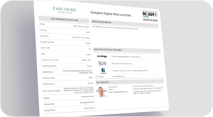 Earlybird Digital West and East KEY CORPORATE FACTS / KPIs INVESTOR DESCRIPTION Offices Berlin, Munich, Istanbul Early Stage Venture, Investments in disruptive digital businesses in Europe. Founded 1997 Employees 35 (of which 35 in Europe) Current Fund Size €150m Use of Debt No SELECTED PORTFOLIO COMPANIES AUM €750m • Vertically integrated platform for moving services Target Investment Size €500k – €15m • Banking product for smartphones Target Geographies Europe Target Sectors Consumer and enterprise internet, fin-tech, • Enterprise-ready, open core, in memory computing software marketplaces, SaaS Investment Style Active Full Portfolio • www.earlybird.com Deal Structures Minority KEY CONTACTS Disruptive business models or technologies • Cem Sertoglu • Prior Founder & CEO Select Minds Key Investment Criteria with forward looking lock-in in large markets • Partner • Focusing on technology ventures in Turkey and CEE lead by an outstanding team • Email: [email protected] • Companies: dcs+, flipps, hazelcast, peak games, Website www.earlybird.com tapu.com, dolap.com, apsiyon Contact Email [email protected] Contact Phone +49 30 46724700