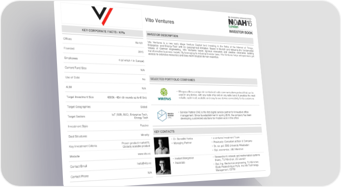 Vito Ventures KEY CORPORATE FACTS / KPIs INVESTOR DESCRIPTION Offices Munich Vito Ventures is a new early stage Venture Capital fund investing in the fields of the Internet of Things, Enterprise- and Energy-Tech with no geographical limitation. Based in Munich and following the fundamental values of German engineering, Vito Ventures backs rigorous executors and creative visionaries building Founded 2015 transformative business models. By leveraging its industrial investor base, Vito Ventures helps entrepreneurs get access to extensive resources and deep technological domain expertise. Employees 4 (of which 4 in Europe) Current Fund Size N/A Use of Debt No SELECTED PORTFOLIO COMPANIES AUM N/A • Wirepas offers a unique de-centralized radio communications protocol that can be used in any device, with any radio chip and on any radio band. It provides the most Target Investment Size €300k - €3m (in rounds up to €10m) reliable, optimized, scalable and easy to use device connectivity for its customers Target Geographies Global IoT (B2B, B2C), Enterprise Tech, • Service Partner ONE is the first digital service partner for innovative office Target Sectors Energy Tech management. Since its establishment in spring 2015, the company has been developing customized solutions for modern work in the office Investment Style Passive Deal Structures Minority KEY CONTACTS • Dr. Benedikt Herles • e.ventures Investment Team Key Investment Criteria Proven product market fit, • Managing Partner • Previously: Consultant at Bain & Company Globally scalable product • Dr. rer. pol. EBS University Wiesbaden Website www.vito.vc • Dipl. economics. LMU München • Herbert Mangesius • Researcher in network and mathematical systems Contact Email [email protected] • Associate theory, TU München, UC Louvain • Dipl. Ing. Mechanical engineering, TU München, Contact Phone N/A École Polytechnique Paris. Hrs MA Technology Management, CDTM