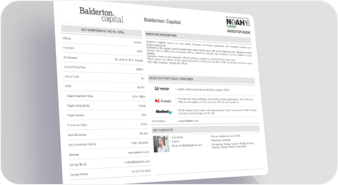 Balderton Capital KEY CORPORATE FACTS / KPIs INVESTOR DESCRIPTION Offices London Balderton Capital’s focus is on early stage, European technology businesses, with ambitious founders and unique approaches. Balderton is the largest Europe focused early stage venture fund, with funds totalling $2.3bn. Balderton invests Founded 2000 between $1m to $20m into companies with the potential to disrupt huge industries, and the ambition to scale globally. Balderton invests for the long term, with the ability to support our companies from start to exit. Employees 30 (of which 30 in Europe) What makes them different is the equal partnership, including two founders of $bn companies and former execs from Uber, Dropbox, Google and Yahoo. Current Fund Size $305m Use of Debt No SELECTED PORTFOLIO COMPANIES AUM $2.3bn • Leading mobile casual games developer, based in Berlin Target Investment Size $1m - $20m • The future of music publishing, ensuring their artists (representing ~40% of the top 100) are paid rapidly and fairly across all offline & online platforms Target Geographies Europe • World-leading online retailer, with proprietary tech stack, focussed on health & beauty Target Sectors Tech and active across Europe and the US Investment Style Active Full Portfolio • www.balderton.com Deal Structures Minority KEY CONTACTS • Rob Moffat • Partner at Balderton since 2009 Key Investment Criteria Team, disruptive • Partner • Previously at Google • Email: [email protected] • Companies: Wooga, Carwow, Prodigy Finance, Website www.balderton.com Nutmeg, Rentify, Patients Know Best Contact Email [email protected] Contact Phone +44207016 6800