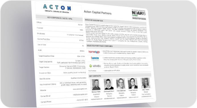 Acton Capital Partners KEY CORPORATE FACTS / KPIs INVESTOR DESCRIPTION Offices Munich Acton Capital Partners is a growth-stage venture capital firm, based in Munich. With investments in more than 65 companies since 1999, the Acton team brings a wealth of expertise and experience to the companies in which it invests, delivering superior capital returns. The ideal investment candidates are Internet companies in the Founded 1999 consumer or B2B-SaaS space with proven and scalable business models, striving to take their growth opportunities to the next level. Acton’s current fund was initiated in 2014 with a volume of €170m and has so far invested amongst others in Employees 14 (of which 13 in Europe) HomeToGo,Tictail, iwoca, GetSafe, Mambu, Mobify, Eloquii, Comatch, Finanzcheck.de and Chefs Plate. With its previous fund (vintage 2008), Acton had invested in companies such as Linas Matkasse, Windeln.de, MyOptique Group, mytheresa.com, Etsy, Audibene, Momox, KupiVIP and Clio. Before 2008, the Acton team had invested Current Fund Size €170m through the Burda Digital Ventures fund I and II in companies like Ciao, HolidayCheck, Zooplus, OnVista, Cyberport, AbeBooks and Alando. Use of Debt No SELECTED PORTFOLIO COMPANIES AUM €350m • HomeToGois an independent meta search engine for vacation rentals combining the models of enquiry and immediate booking. Based in Berlin. Target Investment Size €3m - €15m • London-based iwoca provides short-term financing to SMEs. Launched in 2012, Europe (>70%) iwoca has already grown into one of Europe's leading fintech lenders. Target Geographies RoW, particularly North America (up to 30%) • Mambuoffers an agile, flexible and affordable cloud banking platform that enables Consumer Internet & B2B, E-Commerce, innovative banking providers to rapidly create, launch and service loan and deposit Target Sectors E-Services, Marketplaces, SaaS products. Based in Berlin. Investment Style Active (seeking board membership) Full Portfolio • actoncapital.com/#Portfolio Deal Structures Qualified minority stakes KEY CONTACTS Key Investment Criteria B2C or B2B-SaaS focus, cash-generative, growth stage, selectively early (no seed) Website www.actoncapital.com Marcus Polke Christoph Braun Fritz Oidtmann Frank Seehaus Aline Vedder Contact Email [email protected] Investment Managing Managing Managing Director Director Partner Partner Partner Communications Contact Phone +49 89 2421 8870 [email protected] [email protected] [email protected] [email protected] [email protected]