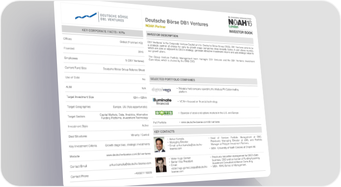 Deutsche Börse DB1 Ventures NOAH Partner KEY COKEY CORPORPORARATE TE FAFACTS CTS / / KPIsKPIs INVESTOR DESCRIPTION Offices Global (Frankfurt HQ) DB1Ventures’ is the Corporate Venture Capital arm for Deutsche Börse Group (DBG). DB1 Ventures aims to be a strategic partner of choice for early to growth stage companies (bias towards Series A and above rounds), which are core or adjacent to DBG’s strategy, generate attractive investment returns and add strategic value to Founded 2016 our growth plans. The Group Venture Portfolio Management team manages DB1 Ventures and the DB1 Ventures Investment Employees 5 (DB1 Ventures) Committee,which is chaired by the DBG CEO. Current Fund Size Deutsche Börse Group Balance Sheet Use of Debt No SELECTED PORTFOLIO COMPANIES AUM N/A • Privately held company operating the Medusa FX Option trading platform Target Investment Size €2m – €25m • VC firm focused on financial technology Target Geographies Europe, US (Asia opportunistic) Capital Markets, Data, Analytics, Alternative • Operator of stock and options markets in the U.S. and Europe Target Sectors Funding Platforms, Investment Technology Investment Style Active Full Portfolio • www.deutsche-boerse.com/db1ventures Deal Structures Minority / Control KEY CONTACTS • Ankur Kamalia • Head of Venture Portfolio Management at DBG. Key Investment Criteria Growth stage bias, strategic investments • Managing Director Previously Managing Director at UBS, and Portfolio • Email: ankur.kamalia@deutsche- Manager at Polygon Investment Partners. boerse.com • MBA-University of North Carolina at Chapel Hill. Website www.deutsche-boerse.com/db1ventures • Victor Hugo Gomez • Previously Innovation management for DBG’s Data Contact Email [email protected] • Senior Vice President business, CEO and co-founder of Funding4Learning, • Email: Investment Consultant at Mercer Consulting. victor.hugo.gomez.zerpa@deutsche- • MBA - WHU School of Management. Contact Phone +496921116699 boerse.com