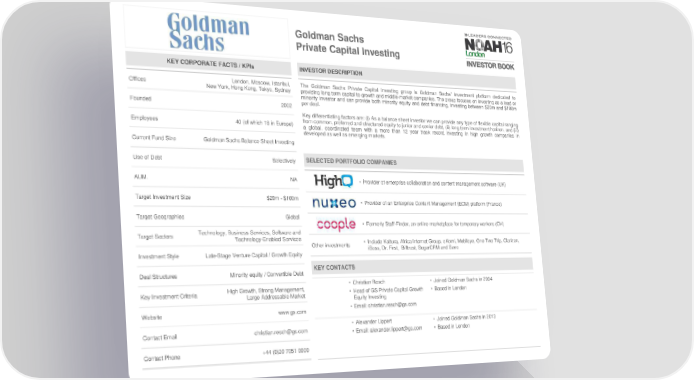 Goldman Sachs Private Capital Investing KEY CORPORATE FACTS / KPIs INVESTOR DESCRIPTION Offices London, Moscow, Istanbul, The Goldman Sachs Private Capital Investing group is Goldman Sachs’ investment platform dedicated to New York, Hong Kong, Tokyo, Sydney providing long term capital to growth and middle-market companies. The group focuses on investing as a lead or minority investor and can provide both minority equity and debt financing, investing between $20m and $100m Founded 2002 per deal. Key differentiating factors are: (i) As a balance sheet investor we can provide any type of flexible capital ranging Employees 40 (of which 18 in Europe) from common, preferred and structured equity to junior and senior debt, (ii) long term investment horizon, and (iii) a global, coordinated team with a more than 12 year track record investing in high growth companies in developed as well as emerging markets. Current Fund Size Goldman Sachs Balance Sheet Investing Use of Debt Selectively SELECTED PORTFOLIO COMPANIES AUM. NA • Provider of enterprise collaboration and content management software (UK) Target Investment Size $20m - $100m • Provider of an Enterprise Content Management (ECM) platform (France) Target Geographies Global • Formerly Staff-Finder, an online marketplace for temporary workers (CH) Target Sectors Technology, Business Services, Software and Technology-Enabled Services • Include Kaltura, Africa Internet Group, eKomi, Mobileye, One Two Trip, Clarizen, Other investments iBoss, Dr. First, Billtrust, SugarCRM and Savo Investment Style Late-Stage Venture Capital / Growth Equity Deal Structures Minority equity / Convertible Debt KEY CONTACTS High Growth, Strong Management, • Christian Resch • Joined Goldman Sachs in 2004 Key Investment Criteria Large Addressable Market • Head of GS Private Capital Growth • Based in London Equity Investing Website www.gs.com • Email: [email protected] • Alexander Lippert • Joined Goldman Sachs in 2013 Contact Email [email protected] • Email: [email protected] • Based in London Contact Phone +44 (0)20 7051 0000