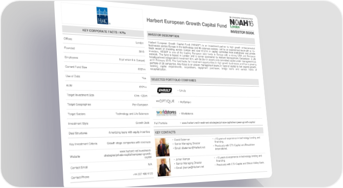 Harbert European Growth Capital Fund KEY CORPORATE FACTS / KPIs INVESTOR DESCRIPTION Offices London Harbert European Growth Capital Fund (“HEGCF”) is an investment partner to high growth entrepreneurial businesses across Europe in the technology and life sciences sectors. Led by an experienced team with a 10+ track record of investing across Europe and over €121m in capital committed from institutional and private Founded 2013 investors, HEGCF is one of the leading European debt funds in Europe with a strong USA and European network. The fund is based in London and is corner sponsored by Harbert Management Corporation, a US headquartered independent investment firm, with $4.3bn in assets and committed capital under management as Employees 9 (of which 9 in Europe) at 01 February 2015. The fund looks for investment opportunities in high growth businesses and has a growing portfolio of 28 companies. Key focus is on proven management teams in need of capital to fuel organic growth, working capital requirements, acquisitions, equipment purchases, bridge loans and various forms of Current Fund Size €121m recapitalization. Use of Debt Yes SELECTED PORTFOLIO COMPANIES AUM €121m • Unruly Target Investment Size €1m - €25m • MyOptique Target Geographies Pan-European Target Sectors Technology and Life Sciences • Worldstores Investment Style Growth Debt Full Portfolio • www.harbert.net/investment-strategies/private-capital/european-growth-capital/ Deal Structures Amortizing loans with equity incentive KEY CONTACTS Key Investment Criteria Growth stage companies with revenues • David Bateman • +10 years of experience in technology lending and • Senior Managing Director financing. www.harbert.net/investment- • Email: [email protected] • Previously with ETV Capital and Broadview Website strategies/private-capital/european-growth- International. capital • Johan Kampe • +15 years of experience in technology lending and Contact Email N/A • Senior Managing Director financing. • Email: [email protected] • Previously with ETV Capital and Silicon Valley Bank. Contact Phone +44 207 408 4120