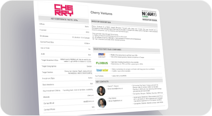 Cherry Ventures KEY CORPORATE FACTS / KPIs INVESTOR DESCRIPTION Offices Berlin Cherry Ventures is a Berlin based, European focused early stage tech investor that was founded and is managed by three entrepreneurs that have co-founded, managed and exited some of Europe’s most successful internet companies, such as Zalando and CityDeal/Groupon. Founded 2012 They generate value through three levers: 1) Strong entrepreneurial background of the entire team Employees 10 (of which 10 in Europe) 2) LP-network of some of Europe’s most successful investors and entrepreneurs 3) Fast, structured and data-driven decision process Current Fund Size €150m+ Use of Debt No SELECTED PORTFOLIO COMPANIES AUM N/A • Platform for consumers to sell their cars C2B • One of the fastest growing internet companies in Europe Target Investment Size Initial invest of €300k to €1.5m in seed & pre- series A, up to €10m in follow-on rounds • Germany’s leading long-distance bus provider • Market share of >70% and 10m+ passengers in 2014 Target Geographies Europe • Online marketplace to compare and book multi-day group tours worldwide Target Sectors Consumer internet, SaaS, (sales-driven) • 14,000+ tours online bookable marketplace, retail & brand building Investment Style Active Full Portfolio • www.cherry.vc/portfolio Deal structures N/A KEY CONTACTS • Daniel P. Glasner • Co-founded City Deal in Europe and sold it to Key Investment Criteria Founding team, level of ambition, scalability, • Email: [email protected] Groupon after 6 months in 2010. Co-founded Quandoo in 2012 with international growth strategy and sold it in 2015 for € 200m Website cherry.vc • Companies: Groupon, CityDeal, Quandoo, McKinsey • Filip Dames • Helped grow Zalando to € 2bn revenues and IPO in Contact Email [email protected] • Email: [email protected] 2014. Led teams of +500 employees and managed international expansion to 15 European countries Contact Phone N/A • Companies: Zalando, Zalando Lounge, Joda Media