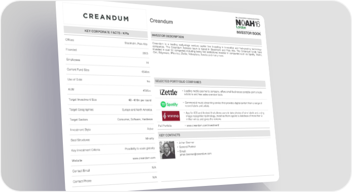 Creandum KEY CORPORATE FACTS / KPIs INVESTOR DESCRIPTION Offices Stockholm, Palo Alto Creandum is a leading early-stage venture capital firm investing in innovative and fast-growing technology companies. The Creandum Advisory team is based in Stockholm and Palo Alto. The Creandum funds have invested in over 50 companies including being first institutional investor in companies such as Spotify, Vivino, Founded 2003 Cint, Edgeware, IPtronics, iZettle, Videoplaza, Xeneta and many more. Employees 14 Current Fund Size €535m Use of Debt No SELECTED PORTFOLIO COMPANIES AUM €535m • Leading mobile payments company, offers small businesses portable point of sale solutions and free sales overview tools Target Investment Size €0 - €10m per round • Commercial music streaming service that provides digital content from a range of record labels and artists Target Geographies Europe and North America • App for iOS and Android that allows users to take photos of wine labels and, using image recognition technology, matches them against a database of more than 3 Target Sectors Consumer, Software, Hardware million wines and gives the reviews Investment Style Actve Full Portfolio • www.creandum.com/investment/ Deal Structures Minority KEY CONTACTS • Johan Brenner Key Investment Criteria Possibility to scale globally • General Partner • Email: Website www.creandum.com [email protected] Contact Email N/A Contact Phone N/A