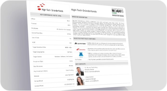 High-Tech Gründerfonds KEY CORPORATE FACTS / KPIs INVESTOR DESCRIPTION Offices Bonn High-Tech Gründerfonds (HTGF) is Germany’s most active and leading seed stage investor. We finance technology-driven companies in the fields of cleantech, robotics, drug development, chemical processes or new software. The fund is focused on investing in small companies (younger than 1 year) with a high level of Founded 2005 innovation. The company or an independent branch of it is domiciled in Germany. It must be based upon a technological innovation – significant and close to proof of concept with in-depth technological knowledge and expertise. The aim is to overcome the gap in early-stage enterprise finance and to enable the firm to obtain risk Employees 45 (of which 45 in Europe) capital. Typically, High-Tech Gründerfonds invests EUR 600,000 in the seed stage, with the potential for up to a total of EUR 2 million per portfolio company in follow-on financing. Investors in this public/private partnership include the Federal Ministry of Economics and Energy, the KfW Banking Group, as well as strategic corporate Current Fund Size €576m investors. High-Tech Gründerfonds has about EUR 576 million under management in two funds (EUR 272 million HTGFI,EUR304millionHTGFII). Use of Debt No SELECTED PORTFOLIO COMPANIES AUM N/A • Outfittery takes the pain out of shopping for men by providing the first personal shopping service for customers, who want to be dressed well, but hate shopping Target Investment Size €600k - €2m • Ubermetrics refines and filters public information from online and offline sources to help companies optimize business decisions and performance Target Geographies Germany • VMRay’s monitoring and analysis technology utilizes advanced hardware- virtualization for the analysis of malware, such as regular viruses, worms, trojans, Target Sectors Hardware, Software, Life Science spyware, but also complex and sophisticated kernel rootkits and bootkits Investment Style Active Full Portfolio • http://high-tech-gruenderfonds.de/en/#network-events Deal Structures Minority KEY CONTACTS • Dr. Alex von Frankenberg Key Investment Criteria Seed Funding • Managing Director • Email: [email protected] Website www.htgf.de/en/ • Chiara Sommer Contact Email [email protected] • Investment Manager • Email: [email protected] Contact Phone +49 228-82300-100