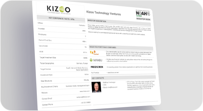 Kizoo Technology Ventures KEY CORPORATE FACTS / KPIs INVESTOR DESCRIPTION Offices Karlsruhe Kizoo helps young start-up teams grow. We provide seed and early stage financing with a focus on SaaS, Internet & Mobile Services and Social Applications. Apart from their financial resources, they are happy to share our longtime experience in development, marketing and product management in those markets. Founded 2008 Kizoo is looking for committed entrepreneurial teams with a clear focus to build high growth products. Employees 3 Current Fund Size €30m Use of Debt No SELECTED PORTFOLIO COMPANIES AUM €11m • The market-leading app for online learning makes it easy to access languages from English to Indonesian either from home, or on the go with a smartphone or tablet. Babbel combines high-quality courses with modern technology Target Investment Size €500k • Enables any financial institution to easily deliver state-of-the-art banking through its software-as-a-service cloud solution Target Geographies Germany, Europe SaaS, Internet & Mobile Services, • E-recruiting solution that enables organisations to optimise their recruiting process Target Sectors Social Applications Investment Style Active Full Portfolio • www.kizoo.com/en/ Deal Structures Minority KEY CONTACTS • Matthias Hornberger • CFO of Kizoo. Part of the senior management team Key Investment Criteria business model, management team • CFO since the IPO of the AG in 2000. He has a long- • Email: [email protected] standing experience in the investment sector and a comprehensive knowledge of typical features of Website www.kizoo.com successful business models on the Internet. Contact Email [email protected] Contact Phone +49721 51600