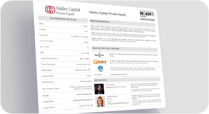 Oakley Capital Private Equity KEY CORPORATE FACTS / KPIs INVESTOR DESCRIPTION Offices London Oakley Capital Private Equity is a firm founded by an entrepreneur from the business community, rather than a spin-out from a larger financial institution. Headquartered in London, Oakley Capital is a mid-market private equity investor with over €750m under management, investing primarily in Western Europe. Founded 2001 Oakley focuses on primary deals, often buying from founders who are attracted by the entrepreneurial approach or doing carve outs, and it has particular experience in the TMT and online consumer sectors. Employees 22 (of which 22 in Europe) Oakley’s objective is to work proactively with portfolio company management teams, together with other stakeholders, in order to create substantial shareholder value for investors. Current Fund Size €524m Use of Debt Yes SELECTED PORTFOLIO COMPANIES AUM over €750m • Parship is the leading online dating service for discerning singles in German-speaking Europe Target Investment Size €30m – €100m • Founded in 2008, Facile is Italy’s leading online destination for consumers to compare prices for motor insurance, energy, telecoms and personal finance Target Geographies Western Europe, US • North Sails is the global market leader in sails and spars, with strong recurring Target Sectors Digital Consumer, TMT revenues from the sail replacement cycle and an expansive portfolio of patents Investment Style Active Full Portfolio • oakleycapital.com/portfolio/ Deal Structures Primarily majority KEY CONTACTS Primary, proprietary, buy & build, • Peter Dubens • Peter is the founder of Oakley and its associated group of Key Investment Criteria • Managing Partner & Co-Founder businesses, a privately owned asset management and entrepreneur or founder led advisory group • Over the last 30 years Peter has acquired, restructured and Website www.oakleycapital.com consolidated public and private companies • Rebecca Gibson • Rebecca joined Oakley in 2014, where her focus is on deal Contact Email enquiries@oakleycapital.com • Partner origination, execution, portfolio management and position realisation • Email: • Previously a Partner at Cinven, the European private equity Contact Phone +44 (0) 20 7766 6900 rebecca.gibson@oakleycapital.com firm, and a strategy consultant at Bain & Company in the UK & South Africa