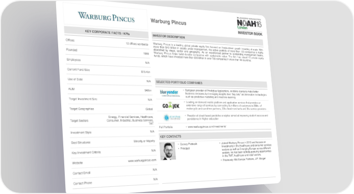 Warburg Pincus KEY CORPORATE FACTS / KPIs INVESTOR DESCRIPTION Offices 12 offices worldwide Warburg Pincus is a leading global private equity firm focused on thesis-driven growth investing at scale. With more than $40 billion in assets under management, the active portfolio of more than 120 companies is highly diversified by stage, sector and geography. As an experienced partner to outstanding management teams, Founded 1966 Warburg Pincus helps build durable companies with sustainable value. The firm has raised 15 private equity funds, which have invested more than $58 billion in over 760 companies in more than 40 countries. Employees N/A Current Fund Size $13.4bn Use of Debt N/A SELECTED PORTFOLIO COMPANIES AUM $40bn • European provider of Predictive Applications, enabling clients to make better business decisions by leveraging insights from “big data” and innovative technologies such as predictive modelling and machine-learning Target Investment Size N/A • Leading on-demand mobile platform and application services that provides an extensive range of services by connecting its millions of customers to 200k+ of Target Geographies Global motorcycle and car driver partners, 35k+ food merchants and 3k+ service providers Energy, Financial Services, Healthcare, • Provider of cloud-based predictive analytics aimed at improving student success and Target Sectors Consumer, Industrial, Business Services, persistence in higher education TMT Full Portfolio • www.warburgpincus.com/investments/ Investment Style N/A KEY CONTACTS Deal Structures Minority or Majority • Cezary Pietrasik • Joined Warburg Pincus in 2010 and focuses on Key Investment Criteria N/A • Principal investments in the healthcare and consumer services sectors as well as Emerging Europe across different sectors. He has been actively pursuing opportunities Website www.warburgpincus.com in the TMT, healthcare and retail sectors. • Previously: Mid Europa Partners, J.P. Morgan Contact Email N/A Contact Phone N/A