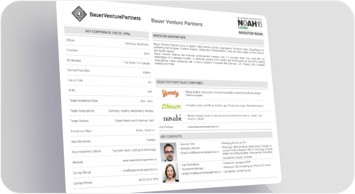 Bauer Venture Partners KEY CORPORATE FACTS / KPIs INVESTOR DESCRIPTION Offices Hamburg, Stockholm Bauer Venture Partners focus on digital media (Owned Content, Aggregators, Functional Apps, Classifieds) and publishing technologies (Content Creation, Distribution & Monetization), early and later stages and the German and Nordic regions. Founded 2014 Bauer Venture Partners are financial, profit-oriented investors. But, if it provides value, they could offer the advantages of a strategic investor, in particular access to the assets and infrastructure of one of the leading international media companies with a strong footprint in markets like Germany, UK, Poland, USA, Australia, Employees 7 (of which 7 in Europe) Nordics and more. Current Fund Size €100m Use of Debt No SELECTED PORTFOLIO COMPANIES AUM N/A • Global leading meta-search and recommendation engine for food and recipies. California-based. Target Investment Size €1m - €7m • A leading calory and fitness tracking app. Featured by Apple. Stockholm-based. Target Geographies Germany, Austria, Switzerland, Nordics • Global category leader in plus-size premium fashion for women. London- and Target Sectors Digital Media and Publishing Tech Aachen- based. Investment Style Active, hands-on Full Portfolio • www.bauerventurepartners.vc/ Deal Structures Flexible KEY CONTACTS • Iskender Dirik • Managing Directo at BVP Key Investment Criteria Top-notch team, scaling by technology • Managing Director • Previously: M&A for Bauer Media Group, Founder of • Email: [email protected] several Product-Startups, MD at Technology & Digital Media Consulting Boutique, Management Consulting Website www.bauerventurepartners.vc • Companies: Navabi, Contorion • Lise Rechsteiner • Investment manager at BVP Contact Email [email protected] • Investment Manager • Previously: MD at Helpling.se, PhD at ETH Zurich • Email: [email protected] • Companies: CareerFoundry Contact Phone +49 40 3019 1078