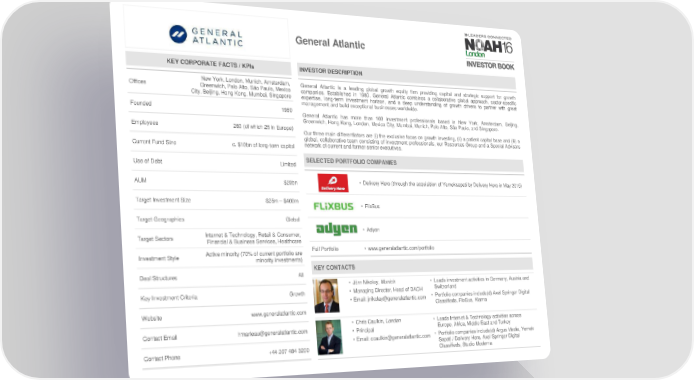 General Atlantic KEY CORPORATE FACTS / KPIs INVESTOR DESCRIPTION New York, London, Munich, Amsterdam, General Atlantic is a leading global growth equity firm providing capital and strategic support for growth Offices Greenwich, Palo Alto, São Paulo, Mexico companies. Established in 1980, General Atlantic combines a collaborative global approach, sector-specific City, Beijing, Hong Kong, Mumbai, Singapore expertise, long-term investment horizon, and a deep understanding of growth drivers to partner with great managementand build exceptional businesses worldwide. Founded 1980 General Atlantic has more than 100 investment professionals based in New York, Amsterdam, Beijing, Greenwich, Hong Kong, London, Mexico City, Mumbai, Munich, Palo Alto, São Paulo, and Singapore. Employees 260 (of which 25 in Europe) Our three main differentiators are (i) the exclusive focus on growth investing, (ii) a patient capital base and (iii) a global, collaborative team consisting of investment professionals, our Resources Group and a Special Advisors Current Fund Size c. $10bn of long-term capital network of current and former senior executives. Use of Debt Limited SELECTED PORTFOLIO COMPANIES AUM $20bn • Delivery Hero (through the acquisition of Yemeksepeti by Delivery Hero in May 2015) Target Investment Size $25m – $400m • FlixBus Target Geographies Global Internet & Technology, Retail & Consumer, • Adyen Target Sectors Financial & Business Services, Healthcare Active minority (70% of current portfolio are Full Portfolio • www.generalatlantic.com/portfolio Investment Style minority investments) KEY CONTACTS Deal Structures All • Jörn Nikolay, Munich • Leads investment activities in Germany, Austria and Key Investment Criteria Growth • Managing Director, Head of DACH Switzerland • Email: [email protected] • Portfolio companies include(d) Axel Springer Digital Classifieds, FlixBus, Klarna Website www.generalatlantic.com • Chris Caulkin, London • Leads Internet & Technology activities across Contact Email [email protected] • Principal Europe, Africa, Middle East and Turkey • Email: [email protected] • Portfolio companies include(d) Argus Media, Yemek Contact Phone +44 207 484 3200 Sepeti / Delivery Hero, Axel Springer Digital Classifieds, Studio Moderna