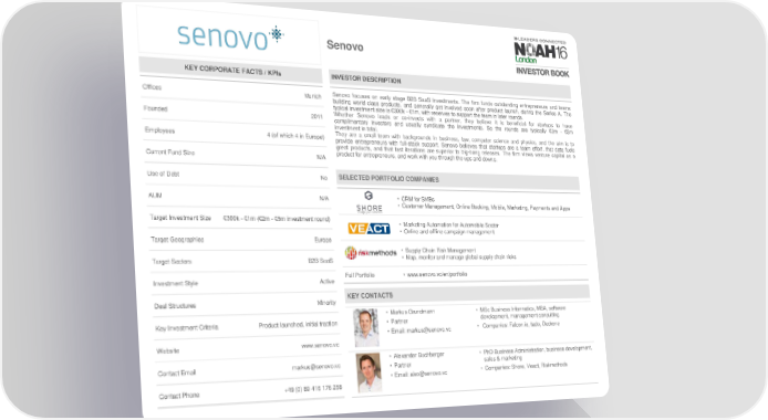 Senovo KEY CORPORATE FACTS / KPIs INVESTOR DESCRIPTION Offices Munich Senovo focuses on early stage B2B SaaS investments. The firm funds outstanding entrepreneurs and teams building world class products, and generally get involved soon after product launch, during the Series A. The typical investment size is €300k - €1m, with reserves to support the team in later rounds. Founded 2011 Whether Senovo leads or co-invests with a partner, they believe it is beneficial for startups to have complimentary investors and usually syndicate the investments. So the rounds are typically €2m - €5m investment in total. Employees 4 (of which 4 in Europe) They are a small team with backgrounds in business, law, computer science and physics, and the aim is to provide entrepreneurs with full-stack support. Senovo believes that startups are a team effort, that data fuels great products, and that fast iterations are superior to big-bang releases. The firm views venture capital as a Current Fund Size N/A product for entrepreneurs, and work with you through the ups and downs. Use of Debt No SELECTED PORTFOLIO COMPANIES AUM N/A • CRM for SMBs • Customer Management, Online Booking, Mobile, Marketing, Payments and Apps Target Investment Size €300k - €1m (€2m - €5m investment round) • Marketing Automation for Automobile Sector • Online and offline campaign management Target Geographies Europe • Supply Chain Risk Management Target Sectors B2B SaaS • Map, monitor and manage global supply chain risks Investment Style Active Full Portfolio • www.senovo.vc/en/portfolio Deal Structures Minority KEY CONTACTS • Markus Grundmann • MScBusiness Informatics, MBA, software Key Investment Criteria Product launched, initial traction • Partner development, management consulting • Email: [email protected] • Companies: Falcon.io, tado, Dedrone Website www.senovo.vc • Alexander Buchberger • PhD Business Administration, business development, Contact Email [email protected] • Partner sales & marketing • Email: [email protected] • Companies: Shore, Veact, Riskmethods Contact Phone +49 (0) 89 416 176 258