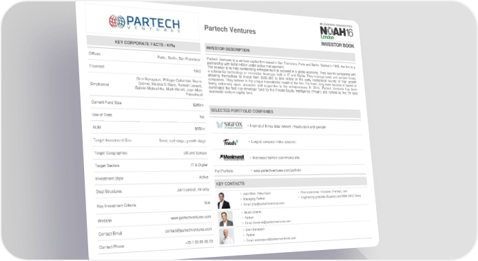Partech Ventures KEY CORPORATE FACTS / KPIs INVESTOR DESCRIPTION Offices Paris , Berlin, San Francisco Partech Ventures is a venture capital firm based in San Francisco, Paris and Berlin. Started in 1982, the firm is a partnership with $650 million under active management. The mission is to help outstanding entrepreneurs to succeed in a global economy. They look for companies with Founded 1982 a substantial technology or innovation leverage, both in IT and Digital. They manage seed and venture funds, allowing themselves to invest from $250,000 to $10 million in the early institutional rounds of high growth Omri Benayoun, Philippe Collombel, Bruno companies. They believe in the unique transatlantic model of the firm. For them, long term success is based on Crémel, Nicolas El Baze, Romain Lavault, being extremely open, proactive and supportive to the entrepreneurs. In 2014, Partech Ventures has been Employees Gabriel Matuschka, Mark Menell, Jean-Marc nominated the first non-American fund by the Private Equity Intelligence (Preqin) and ranked as the 7th best Patouillaud worldwide venture capital fund. Current Fund Size $200m SELECTED PORTFOLIO COMPANIES Use of Debt No • Internet of things data network infrastructure and operator AUM $650m Target Investment Size Seed, earl-stage, growth stage • Largest european video adserver Target Geographies US and Europe • Menswear fashion ecommerce site Target Sectors IT & Digital Full Portfolio • www.partechventures.com/portfolio Investment Style Active KEY CONTACTS Deal Structures Joint control, minority • Jean-Marc Patouillaud • Prior experience: Finovelec (Partner), iom Key Investment Criteria N/A • Managing Partner • Engineering graduate (Supelec) and MBA (HEC Paris) • Email: [email protected] Website www.partechventures.com • Bruno Cremel • Partner • Email: [email protected] Contact Email [email protected] • Omri Benayoun • Partner Contact Phone +33 1 53 65 65 53 • Email: [email protected]