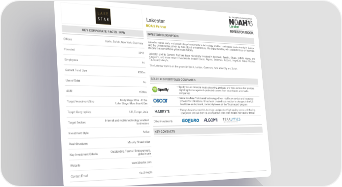 Lakestar NOAH Partner KEY CORPORATE FACTS / KPIs INVESTOR DESCRIPTION Offices Berlin, Zurich, New York, Guernsey Lakestar makes early and growth stage investments in technology-enabled businesses predominantly in Europe and the United States driven by exceptional entrepreneurs. We enjoy investing with a specific focus on business modelsthat can achieve global scale quickly. Founded 2012 Lakestar and its General Partners have historically invested in facebook, Spotify, Skype, airBnB, klarna, and King.com, and more recent investments include Oscar, Algomi, Teralytics, GoEuro, AngelList, Maker Studios, Taulia and Harry’s. Employees 14 TheLakestar team is on the ground in Berlin, London, Guernsey, New York City and Zurich. Current Fund Size €350m SELECTED PORTFOLIO COMPANIES Use of Debt No • Spotify is a commercial music streaming, podcast, and video service that provides AUM €500m digital rights management–protected content from record labels and media companies Early Stage: €1m - €10m • Oscar is a New York based technology-driven healthcare service and insurance Target Investment Size provider for US citizens. It has been created as a reaction to changes in the US Later Stage: More than €10m healthcare environment, commonly known as the “Obamacare” program Target Geographies US, Europe, Asia • Harry’s business model is to design and produce high-quality razors and shaving equipment and sell them at a competitive price point despite high-quality design Target Sectors Internet and mobile technology enabled Other investments businesses Investment Style Active KEY CONTACTS Deal Structures Minority Shareholder Key Investment Criteria Outstanding Teams / Entrepreneurs, global scale Website www.lakestar.com Contact Email via LinkedIn