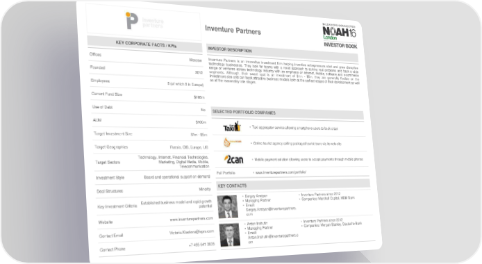 Inventure Partners KEY CORPORATE FACTS / KPIs INVESTOR DESCRIPTION Offices Moscow Inventure Partners is an innovative investment firm helping inventive entrepreneurs start and grow disruptive technology businesses. They look for teams with a novel approach to solving real problems and back a wide range of ventures across technology industry with an emphasis on internet, mobile, software and e-commerce Founded 2012 segments. Although, their sweet spot is an investment of $1m - $5m, they are generally flexible on the investment size and can back attractive business models both at the earliest stages of their development as well as at the reasonably late stages. Employees 8 (of which 8 in Europe) Current Fund Size $100m Use of Debt No SELECTED PORTFOLIO COMPANIES AUM $100m • Taxi aggregator service allowing smartphone users to book a taxi Target Investment Size $1m-$5m • Online tourist agency selling packaged tourist tours via its web-site Target Geographies Russia, CIS, Europe, US Technology, Internet, Financial Technologies, • Mobile payment solution allowing users to accept payments through mobile phones Target Sectors Marketing, Digital Media, Mobile, Telecommunication Investment Style Board and operational support on demand Full Portfolio • www.inventurepartners.com/portfolio/ Deal Structures Minority KEY CONTACTS • Sergey Azatyan • Inventure Partners since 2012 Key Investment Criteria Established business model and rapid growth • Managing Partner • Companies: Marshall Capital, MDM Bank potential • Email: Sergey.Azatyan@inventurepartners. Website www.inventurepartners.com com • Anton Inshutin • Inventure Partners since 2012 Contact Email [email protected] • Managing Partner • Companies: Morgan Stanley, Deutsche Bank • Email: [email protected] Contact Phone +7 495 641 3635 om