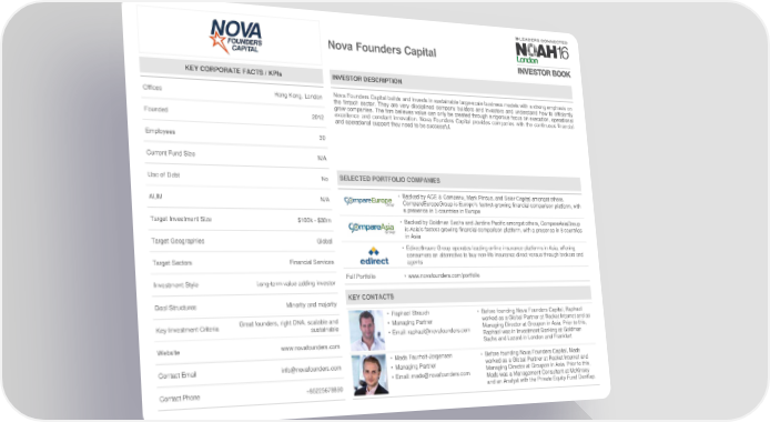 Nova Founders Capital KEY CORPORATE FACTS / KPIs INVESTOR DESCRIPTION Offices Hong Kong, London Nova Founders Capital builds and invests in sustainable large-scale business models with a strong emphasis on the fintech sector. They are very disciplined company builders and investors and understand how to efficiently grow companies. The firm believes value can only be created through a rigorous focus on execution, operational Founded 2012 excellence and constant innovation. Nova Founders Capital provides companies with the continuous financial and operational support they need to be successful. Employees 30 Current Fund Size N/A Use of Debt No SELECTED PORTFOLIO COMPANIES AUM N/A • Backed by ACE & Company, Mark Pincus, and Seier Capital amongst others, CompareEuropeGroup is Europe’s fastest-growing financial comparison platform, with a presence in 5 countries in Europe Target Investment Size $100k - $30m • Backed by Goldman Sachs and Jardine Pacific amongst others, CompareAsiaGroup is Asia’s fastest-growing financial comparison platform, with a presence in 8 countries Target Geographies Global in Asia • EdirectInsure Group operates leading online insurance platforms in Asia, offering consumers an alternative to buy non-life insurance direct versus through brokers and Target Sectors Financial Services agents Investment Style Long-term value adding investor Full Portfolio • www.novafounders.com/portfolio Deal Structures Minority and majority KEY CONTACTS • Raphael Strauch • Before founding Nova Founders Capital, Raphael Key Investment Criteria Great founders, right DNA, scalable and • Managing Partner worked as a Global Partner at Rocket Internet and as sustainable • Email: [email protected] Managing Director at Groupon in Asia. Prior to this, Raphael was in Investment Banking at Goldman Website www.novafounders.com Sachs and Lazard in London and Frankfurt • Mads Faurholt-Jorgensen • Before founding Nova Founders Capital, Mads Contact Email [email protected] • Managing Partner worked as a Global Partner at Rocket Internet and • Email: [email protected] Managing Director at Groupon in Asia. Prior to this, Madswas a Management Consultant at McKinsey Contact Phone +85225678890 and an Analyst with the Private Equity Fund DanKap.