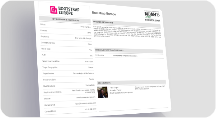 Bootstrap Europe KEY CORPORATE FACTS / KPIs INVESTOR DESCRIPTION Offices Zurich, London Fast growth companies often require additional money to fuel scale, yet their founders and their investors do not want to be diluted. Venture Debt is a way to postpone the next valuation event, and to provide a company with additional time to increase its value prior to a future funding round or an acquisition. The Bootstrap Europe team Founded 2015 has supported entrepreneurs and their investors in more than 200 European transactions. The Venture Debt fund is backed by successful entrepreneurs who in turn are providing a stable source of capital to the next generation of innovators. Employees 3 (of which 3 in Europe) Current Fund Size €40m Use of Debt Yes SELECTED PORTFOLIO COMPANIES AUM N/A Full Portfolio • www.bootstrap-europe.com/transactions Target Investment Size €1m –€5m Target Geographies Europe Target Sectors Techonologies & Life Science Investment Style Passive Deal Structures Venture Debt KEY CONTACTS Fast Growth, can sustain monthy • Fatou Diagne • Entrepreneur in Finance companies, CitiGroup, S&P, Key Investment Criteria reimbursments • Managing Partner SFR, Fractal-Labs.com • Email: [email protected] Website www.bootstrap-europe.com Contact Email [email protected] Contact Phone +41 43 888 6050