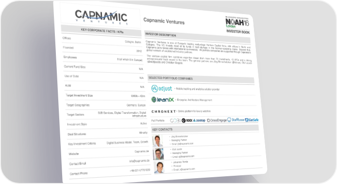 Capnamic Ventures KEY CORPORATE FACTS / KPIs INVESTOR DESCRIPTION Offices Cologne, Berlin Capnamic Ventures is one of Europe’s leading early-stage Venture Capital firms, with offices in Berlin and Cologne. The VC invests most of its funds in tech-startups in the German-speaking region. Beyond that, Capnamic joins forces with international co-investors. All portfolio companies are supported through Capnamic’s Founded 2012 global network of established industry partners. The venture capital firm combines expertise drawn from more than 70 investments, 13 IPOs and a strong Employees 8 (of which 8 in Europe) entrepreneurial track record in the team. The general partners are Jörg Binnenbrücker (@bibrue), Olaf Jacobi (@olafjacobi) and Christian Siegele. Current Fund Size N/A Use of Debt N/A SELECTED PORTFOLIO COMPANIES AUM N/A • Mobile tracking and analytics solution provider Target Investment Size €500k – €3m • Enterprise Architecture Management Target Geographies Germany, Europe B2B Services, Digital Transformation, Digital • Online platform for luxury watches Target Sectors Infrastructure Investment Style Active Full Portfolio Deal Structures Minority KEY CONTACTS • Jörg Binnenbrücker Key Investment Criteria Digital Business Model, Team, Growth • Managing Partner • Email: jb@capnamic.com Website Capnamic.de • Olaf Jacobi • Managing Partner Contact Email info@capnamic.de • Email: oj@capnamic.com • Johannes Rohde Contact Phone +49-221-67781930 • Principal • Email: jr@capnamic.com