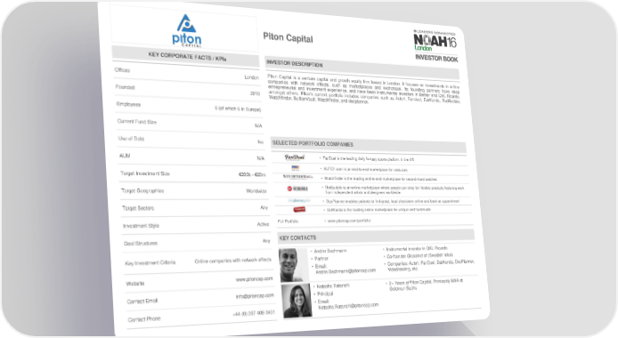 Piton Capital KEY CORPORATE FACTS / KPIs INVESTOR DESCRIPTION Offices London Piton Capital is a venture capital and growth equity firm based in London. It focuses on investments in online companies with network effects, such as marketplaces and exchanges. Its founding partners have deep entrepreneurial and investment experience, and have been instrumental investors in Betfair and QXL Ricardo, Founded 2010 amongst others. Piton’s current portfolio includes companies such as Auto1, Fanduel, DaWanda, RedBubble, Watchfinder, BullionVault, Watchfinder, and docplanner. Employees 6 (of which 6 in Europe) Current Fund Size N/A Use of Debt No SELECTED PORTFOLIO COMPANIES AUM N/A • FanDuel is the leading daily fantasy sports platform in the US • AUTO1.com is an end-to-end marketplace for used cars Target Investment Size €200k - €20m • Watchfinder is the leading end-to-end marketplace for second-hand watches Target Geographies Worldwide • Redbubble is an online marketplace where people can shop for lifestyle products featuring work from independent artists and designers worldwide • DocPlanner enables patients to find great, local physicians online and book an appointment Target Sectors Any • DaWanda is the leading online marketplace for unique and handmade Investment Style Active Full Portfolio • www.pitoncap.com/portfolio/ Deal Structures Any KEY CONTACTS • Andrin Bachmann • Instrumental investor in QXL Ricardo Key Investment Criteria Online companies with network effects • Partner • Co-founder Glocalnet of (Swedish telco) • Email: • Companies: Auto1, FanDuel, DaWanda, DocPlanner, Website www.pitoncap.com [email protected] Videdressing, etc. • Natasha Ratanshi • 2+ Years at Piton Capital, Previously M&A at Contact Email [email protected] • Principal Goldman Sachs • Email: Contact Phone +44 (0) 207 408 0451 [email protected]
