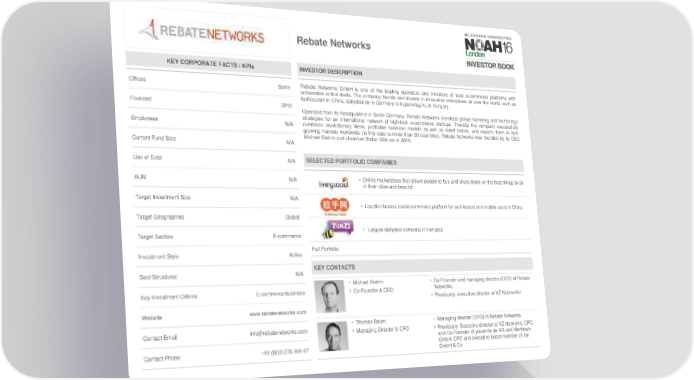Rebate Networks KEY CORPORATE FACTS / KPIs INVESTOR DESCRIPTION Offices Berlin Rebate Networks GmbH is one of the leading operators and investors of local e-commerce platforms with unbeatable online deals. The company founds and invests in innovative enterprises all over the world, such as lashou.com in China, dailydeal.de in Germany or kuponvilag.hu in Hungary. Founded 2010 Operated from its headquarters in Berlin Germany, Rebate Networks develops global marketing and technology strategies for an international network of high-tech e-commerce startups. Thereby the company successfully Employees N/A combines revolutionary ideas, profitable business models as well as latest trends, and exports them to fast- growing markets worldwide (to this date to more than 30 countries). Rebate Networks was founded by its CEO Michael Brehm and chairman Stefan Glänzer in 2010. Current Fund Size N/A Use of Debt N/A SELECTED PORTFOLIO COMPANIES AUM N/A • Online marketplace that allows people to buy and share deals on the best things to do in their cities and beyond Target Investment Size N/A • Location-based, social commerce platform for web-based and mobile users in China Target Geographies Global • Largest dailydeal company in Hungary Target Sectors E-commerce Investment Style Active Full Portfolio Deal Structures N/A KEY CONTACTS • Michael Brehm • Co-Founder and managing director (CEO) of Rebate Key Investment Criteria E-commerce business • Co-Founder & CEO Networks. • Previously: executive director at VZ Netzwerke Website www.rebatenetworks.com • Thomas Baum • Managing director (CFO) of Rebate Networks Contact Email info@rebatenetworks.com • Managing Director & CFO • Previously: Executive director at VZ Netwerke; CFO and Co-Founder of yousmile.de AG and Mentasys Contact Phone +49 (0)30 275 904-87 GmbH; CFO and executive board member of Jon GmbH & Co