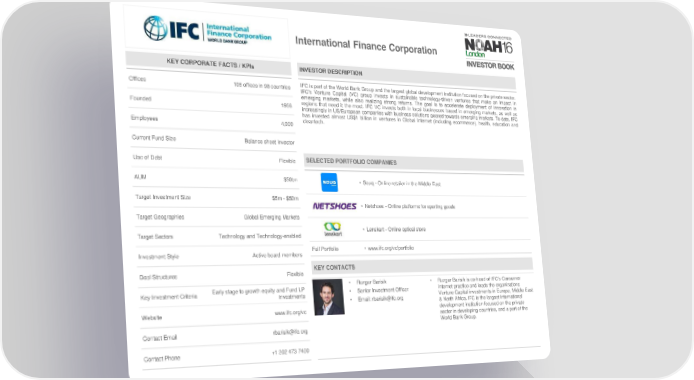 International Finance Corporation KEY CORPORATE FACTS / KPIs INVESTOR DESCRIPTION Offices 108 offices in 98 countries IFC is part of the World Bank Group and the largest global development institution focused on the private sector. IFC’s Venture Capital (VC) group invests in sustainable technology-driven ventures that make an impact in emerging markets, while also realizing strong returns. The goal is to accelerate deployment of innovation in Founded 1956 regions that need it the most. IFC VC invests both in local businesses based in emerging markets, as well as increasingly in US/European companies with business solutions geared towards emerging markets. To date, IFC has invested almost US$1 billion in ventures in Global Internet (including ecommerce), health, education and Employees 4,000 cleantech. Current Fund Size Balance sheet investor Use of Debt Flexible SELECTED PORTFOLIO COMPANIES AUM $50bn • Souq - Online retailer in the Middle East Target Investment Size $5m - $50m • Netshoes - Online platforms for sporting goods Target Geographies Global Emerging Markets • Lenskart - Online optical store Target Sectors Technology and Technology-enabled Full Portfolio • www.ifc.org/vc/portfolio Investment Style Active board members Deal Structures Flexible KEY CONTACTS • Ruzgar Barisik • Ruzgar Barisik is co-head of IFC’s Consumer Key Investment Criteria Early stage to growth equity and Fund LP • Senior Investment Officer Internet practice and leads the organizations investments • Email: [email protected] Venture Capital investments in Europe, Middle East & North Africa. IFC is the largest international Website www.ifc.org/vc development institution focused on the private sector in developing countries, and a part of the World Bank Group. Contact Email [email protected] Contact Phone +1 202 473 7400