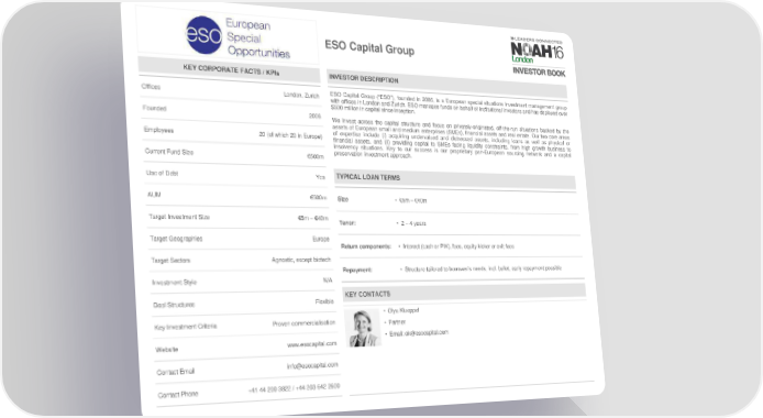 ESO Capital Group KEY CORPORATE FACTS / KPIs INVESTOR DESCRIPTION Offices London, Zurich ESO Capital Group (“ESO”), founded in 2006, is a European special situations investment management group with offices in London and Zurich. ESO manages funds on behalf of institutional investors and has deployed over $500 million in capital since inception. Founded 2006 We invest across the capital structure and focus on privately-originated, off-the-run situations backed by the assets of European small and medium enterprises (SMEs), financial assets and real estate. Our two core areas Employees 20 (of which 20 in Europe) of expertise include (i) acquiring undervalued and distressed assets, including loans as well as physical or financial assets, and (ii) providing capital to SMEs facing liquidity constraints, from high growth business to insolvency situations. Key to our success is our proprietary pan-European sourcing network and a capital Current Fund Size €500m preservation investment approach. Use of Debt Yes TYPICAL LOAN TERMS AUM €500m Size • €5m – €40m Target Investment Size €5m–€40m Tenor: • 2 – 4 years Target Geographies Europe Return components: • Interest (cash or PIK), fees, equity kicker or exit fees Target Sectors Agnostic, except biotech Repayment: • Structure tailored to borrower’s needs, incl. bullet, early repayment possible Investment Style N/A Deal Structures Flexible KEY CONTACTS • Olya Klueppel Key Investment Criteria Proven commercialisation • Partner • Email: [email protected] Website www.esocapital.com Contact Email [email protected] Contact Phone +41 44 200 3822 / +44 203 642 2600