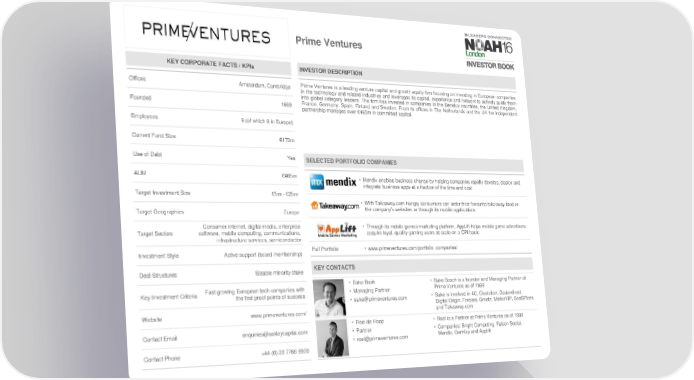 Prime Ventures KEY CORPORATE FACTS / KPIs INVESTOR DESCRIPTION Offices Amsterdam, Cambridge Prime Ventures is a leading venture capital and growth equity firm focusing on investing in European companies in the technology and related industries and leverages its capital, experience and network to actively guide them into global category leaders. The firm has invested in companies in the Benelux countries, the United Kingdom, Founded 1999 France, Germany, Spain, Finland and Sweden. From its offices in The Netherlands and the UK the independent partnership manages over €465m in committed capital. Employees 9 (of which 9 in Europe) Current Fund Size €170m Use of Debt Yes SELECTED PORTFOLIO COMPANIES AUM €465m • Mendix enables business change by helping companies rapidly develop, deploy and integrate business apps at a fraction of the time and cost Target Investment Size €5m - €25m • With Takeaway.com hungry consumers can order their favourite takeaway food on Target Geographies Europe the company’s websites or through its mobile applications Consumer internet, digital media, enterprise • Through its mobile games marketing platform, AppLift helps mobile game advertisers Target Sectors software, mobile computing, communications, acquire loyal, quality gaming users at scale on a CPI basis infrastructure services, semiconductor Investment Style Active support (board membership) Full Portfolio • www.primeventures.com/portfolio_companies/ Deal Structures Sizable minority stake KEY CONTACTS • Sake Bosh • Sake Bosch is a founder and Managing Partner of Key Investment Criteria Fast growing European tech companies with • Managing Partner Prime Ventures as of 1999 the first proof points of success • [email protected] • Sake is involved in 4C, Civolution, Dealerdirect, Digital Origin, Forcare, Greetz, MarkaVIP, SaaSPlaza Website www.primeventures.com/ and Takeaway.com • Roel de Hoop • Roel is a Partner at Prime Ventures as of 1999 Contact Email [email protected] • Partner • Companies: Bright Computing, Falcon Social, • [email protected] Mendix, GenKey and Applift Contact Phone +44 (0) 20 7766 6900