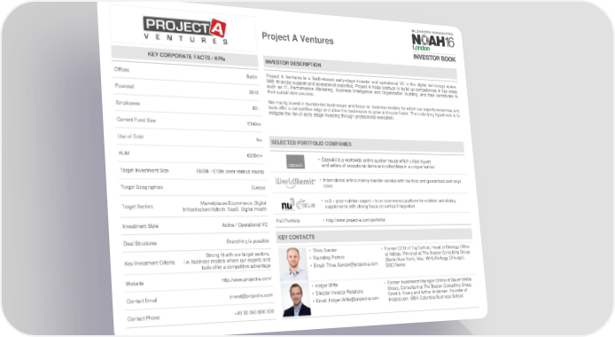Project A Ventures KEY CORPORATE FACTS / KPIs INVESTOR DESCRIPTION Offices Berlin Project A Ventures is a Berlin-based early-stage investor and operational VC in the digital technology space. With financial support and operational expertise, Project A helps startups to build up competences in key areas such as IT, Performance Marketing, Business Intelligence and Organization Building, and thus contributes to Founded 2012 their sustainable success. Wemainly invest in founder-led businesses and focus on business models for which our experts-know-how and Employees 90+ tools offer a competitive edge and allow the businesses to grow and scale faster. The underlying hypothesis is to mitigate the risk of early stage investing through professional execution. Current Fund Size €140m Use of Debt No SELECTED PORTFOLIO COMPANIES AUM €200m+ • Catawiki is a worldwide online auction house which unites buyers and sellers of exceptional items and collectibles in a unique fashion Target Investment Size €500k - €10m (over various round) • International online money transfer service with low fees and guaranteed exchange Target Geographies Europe rates Marketplaces/Ecommerce, Digital • nu3 – your nutrition expert – is an ecommerce platform for nutrition and dietary Target Sectors Infrastructure/Adtech, SaaS, Digital Health supplements with strong focus on vertical integration Investment Style Active / Operational VC Full Portfolio • http://www.project-a.com/portfolio/ Deal Structures Everything is possible KEY CONTACTS Strong fit with our target sectors, • Thies Sander • Former CEO of TopTarif.de, Head of Strategy Office Key Investment Criteria i.e. business models where our experts and • Founding Partner at Adidas, Principal at The Boston Consulting Group tools offer a competitive advantage • Email: [email protected] (Berlin/New York). Msc. WHU/Kellogg (Chicago), ESC Reims Website http://www.project-a.com/ • Holger Witte • FormerInvestment Manager Online at Bauer Media Contact Email [email protected] • Director Investor Relations Group, Consultant at The Boston Consulting Group, • Email: [email protected] Ernst & Young and Arthur Andersen, Founder of Intabid.com. MBA Columbia Business School Contact Phone +4930 340 606 300