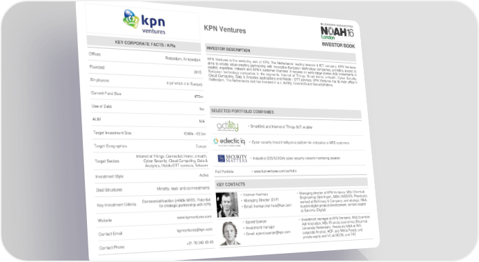 KPN Ventures KEY CORPORATE FACTS / KPIs INVESTOR DESCRIPTION Offices Rotterdam, Amsterdam KPN Ventures is the venturing arm of KPN, The Netherlands’ leading telecom & ICT company. KPN Ventures aims to create value-creating partnership with innovative European technology companies, providing access to capital, expertise, network and KPN’s customer channels. It focuses on early-stage (series A/B) investments in Founded 2015 European technology companies in the segments: Internet of Things, Smart Home, e-Health, Cyber Security, Cloud Computing, Data & Analytics applications and Mobile / OTT services. KPN Ventures has its main office in Rotterdam, The Netherlands and has invested in a.o. Actility, EclecticIQ and SecurityMatters. Employees 4 (of which 4 in Europe) Current Fund Size €70m Use of Debt No SELECTED PORTFOLIO COMPANIES AUM N/A • SmartGrid and Internet of Things (IoT) enabler Target Investment Size €500k - €2.5m • Cyber security threat intelligence platform for enterprise or MSS customers Target Geographies Europe Internet of Things, Connected Home, eHealth, • Industrial (ICS/SCADA) cyber security network monitoring solution Target Sectors Cyber Security, Cloud Computing, Data & Analytics, Mobile/OTT services, Telecom Investment Style Active Full Portfolio • www.kpnventures.com/portfolio Deal Structures Minority, lead- and co-investments KEY CONTACTS • Herman Kienhuis • Managing director at KPN Ventures. MSc Chemical Key Investment Criteria Commercial traction (>€40k MRR), Potential • Managing Director (EVP) Engineering (Groningen), MBA (INSEAD). Previously, for strategic partnership with KPN • Email: [email protected] worked at McKinsey & Company, and strategy, M&A, busdev/digital product development, venture capital Website www.kpnventures.com at Sanoma (Digital) • Sjoerd Spanjer • Investment manager at KPN Ventures. MSc Business Contact Email [email protected] • Investment manager Administration, MSc Financial economics (Erasmus • Email: [email protected] University Rotterdam). Previously M&A at ING corporate finance, HCF, and White Forest, and Contact Phone +31 70 343 43 43 private equity and VC at NEON, and TNT