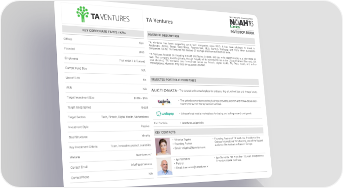 TA Ventures KEY CORPORATE FACTS / KPIs INVESTOR DESCRIPTION Offices Kiev TA Ventures has been supporting great tech companies since 2010. It has been privileged to invest in Auctionata, Azimo, Beepi, Dreamlines, FinanzCheck, NU3, SumUp, Wallapop and many other successful companies. So far, TA Ventures has backed 97 startups and have achieved 22 exits. Founded 2010 TA Ventures focuses on investing in seed and Series A deals, and can write bigger checks at a later stage as well. The company invests globally, though majority of its investments are in the US and Europe (Germany, UK Employees 7 (of which 7 in Europe) and Ukraine). TA Ventures core investment areas are fintech, digital health, Big Data, SaaS, and online marketplaces. However, they also invest across sectors. Current Fund Size N/A Use of Debt No SELECTED PORTFOLIO COMPANIES AUM N/A • The curated online marketplace for antiques, fine art, collectibles and vintage luxury. Target Investment Size $100k - $1m • The global payment processing business providing internet and mobile based inter- country consumer money transfer services Target Geographies Global • A hyper-local mobile marketplace for buying and selling secondhand goods Target Sectors Tech, Fintech, Digital Health, Marketplaces Investment Style Passive Full Portfolio • taventures.vc/portfolio Deal Structures Minority KEY CONTACTS • Viktoriya Tigipko • Founding Partner of TA Ventures. President of the Key Investment Criteria Team,innovative product, scalability • Founding Partner Odessa International Film Festival, one of the biggest • Email: [email protected] audience film festivals in Eastern Europe. Website taventures.vc/ • Igor Semenov • Igor Semenov has more than 15 years of experience Contact Email [email protected] • Partner in venture capital business. • Email: [email protected] Contact Phone N/A