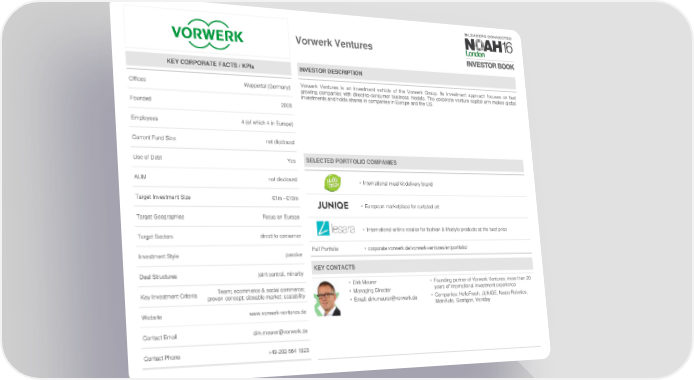 Vorwerk Ventures KEY CORPORATE FACTS / KPIs INVESTOR DESCRIPTION Offices Wuppertal (Germany) Vorwerk Ventures is an investment vehicle of the Vorwerk Group. Its investment approach focuses on fast growing companies with direct-to-consumer business models. The corporate venture capital arm makes global investments and holds shares in companies in Europe and the US. Founded 2008 Employees 4 (of which 4 in Europe) Current Fund Size not disclosed Use of Debt Yes SELECTED PORTFOLIO COMPANIES AUM not disclosed • International meal kit delivery brand Target Investment Size €1m - €10m • European marketplace for curtated art Target Geographies Focus on Europe • International online retailer for fashion & lifestyle products at the best price Target Sectors direct to consumer Investment Style passive Full Portfolio • corporate.vorwerk.de/vorwerk-ventures/en/portfolio/ Deal Structures joint control, minority KEY CONTACTS Team; ecommerce & social commerce; • Dirk Meurer • Founding partner of Vorwerk Ventures; more than 20 Key Investment Criteria proven concept; sizeable market; scalability • Managing Director years of international investment experience • Email: [email protected] • Companies: HelloFresh, JUNIQE, Neato Robotics, MeinAuto, Gestigon, Vaniday Website www.vorwerk-ventures.de Contact Email [email protected] Contact Phone +49-202-564 1923
