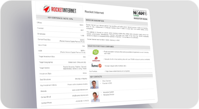 Rocket Internet KEY CORPORATE FACTS / KPIs INVESTOR DESCRIPTION Offices Berlin Rocket Internet is an Internet platform that identifies and builds proven internet business models and transfers them to new, underserved or untapped markets where it seeks to scale them into market leading online companies. Founded 2007 The platform is focused on proven online business models that satisfy basic consumer needs across four sectors: e-Commerce, Marketplaces, Financial Technology and Travel. It has more than 36,000 employees Employees 1,496 across its network of companies which operate in more than 110 countries on six continents. $420m Rocket Internet was founded in Berlin, Germany, in 2007. Current Fund Size (Rocket Internet Capital Partners Fund) Use of Debt N/A SELECTED PORTFOLIO COMPANIES AUM $420m • Food subscription company that sends pre-portioned ingredients to users’ doorstep (Rocket Internet Capital Partners Fund) each week Target Investment Size N/A • Network of online food ordering sites with over 73,000 restaurant partners worldwide Target Geographies Global (excl. China and US) Food & Groceries, Fashion, General • Europe’s largest online furniture store Target Sectors Merchandise, Home & Living, Travel Investment Style Active Full Portfolio • https://www.rocket-internet.com/companies Deal Structures Minority or Majority KEY CONTACTS • Oliver Samwer Key Investment Criteria Proven online business models • Founder & CEO Website www.rocket-internet.com • Alexander Kudlich Contact Email info@rocket-internet.com • Managing Director Contact Phone +49 30 300 13 18-00