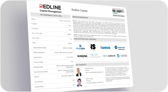 Redline Capital KEY CORPORATE FACTS / KPIs INVESTOR DESCRIPTION Offices London, Luxembourg Redline’s funds originate from Mr. Vladimir Evtushenkov, the majority shareholder and principal founder of Sistema, listed on the London Stock Exchange. Sistema is one of Russia’s largest publicly listed investment companies and has been investing in various technology segments for over twenty years. Sistema is the majority Founded N/A shareholder of Mobile TeleSystems (MTS), listed on the NYSE. MTS is the leading telecommunications group in Russia, Central and Eastern Europe, offering mobile and fixed voice, broadband, pay TV as well as content and entertainment services. MTS services over 100 million mobile subscribers. In addition, through its many portfolio Employees N/A companies Sistema also holds leading positions in a range of other sectors, including Media, Radio, Security, Microelectronics, Healthcare, Retail, Pharmaceuticals, and Transportation. Sistema has a long history of strategic partnerships with global companies such as Deutsche Telekom, Allianz and Philips. Current Fund Size €350m Redline is looking to back strong management teams, to buy into their vision and strategy, and lend its support through all stages of their development Use of Debt No SELECTED PORTFOLIO COMPANIES AUM €350m Target Investment Size Series A onwards (exited to eBay) Target Geographies Europe, North America and Israel Target Sectors Technology Investment Style N/A Deal Structures Minority, with and without board KEY CONTACTS representation Team, IP, growth track record, • Michael Hecker • Previously worked as a Venture Investor in Berlin Key Investment Criteria market potential • Partner (e.g. MeinFernbus/Flixbus, High-Mobility), he was VP • Email: [email protected] for Strategy and Member of the Management board at JSFC Sistema and VP for Strategy, M&A and Website www.redline-capital.com Corporate Development and Member of the Management Board of MTS GroupCompanies Contact Email N/A • Benno Jering • Previously worked with two boutique tech investment • Principal banks in London and Credit Suisse’s TMT Investment • Email: [email protected] Banking team Contact Phone N/A