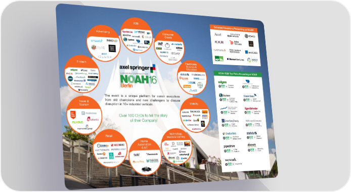 B2B Selected Investors Presenting at NOAH Advertising Consumer Goods eventures Fintech Healthcare, Science & Education NOAH B2B Top Picks Presenting at NOAH Payment Professional Services Networking The event is a unique platform for senior executives Business Wealth from old champions and new challengers to discuss Process Management Travel & Outsourcing Tourism disruption in 10+ industrial verticals. Mobility Secondary Leadership Over 100 CEOs to tell the story Market Services of their Company! Legal Strategy Services Consulting Retail Technology, Media & Gaming Audience Market Home Measurement Research Automation & IoT CRM Marketing Platform Cloud Coworking 7